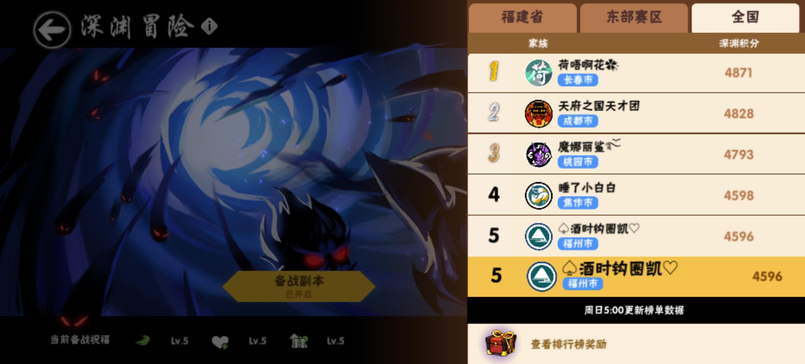 一区深渊家族冰可乐里泡枸杞招人啦 上赛季国十深渊 本周国九 家族稳定联赛64强主微信群聊天,有QQ指挥频道。 家族福利: 1.全员周常SS+:深渊伤害匹配个人配置 2.带全首领关卡,六星悬赏和藏宝图逆袭悬赏等3.常驻高顶配免费上无双(质量拉满3个月) 4.常驻高顶配免费打老逆袭头像(质量拉满3个月) 有想法的滴滴qq审核群:869671451