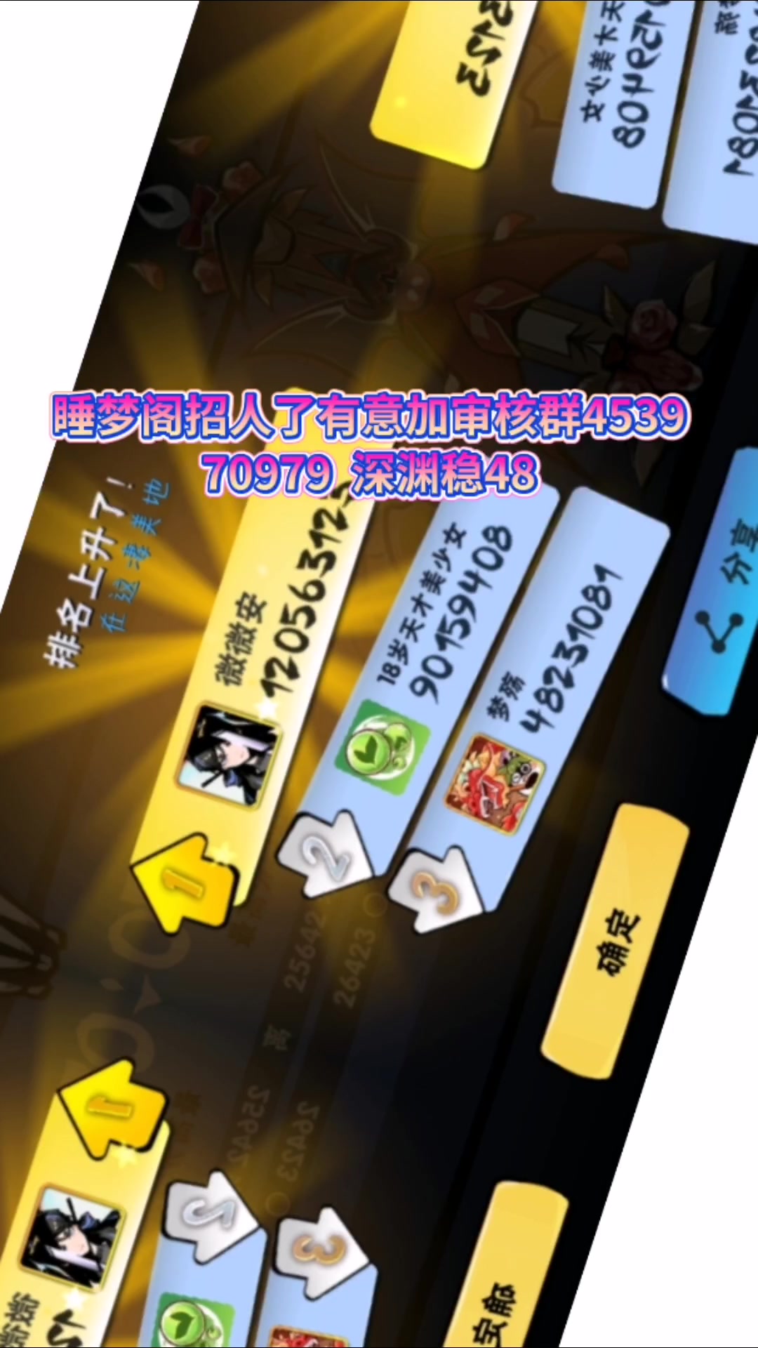睡梦阁招人了有意加审核群453970979 深渊稳48冲50大佬多多可带悬赏首领按照贡献免费跑竞场 要求:1族战必须来一次团本必须S以上 2深渊必须拉满会不定时抽奖SS加躺位 3平时备战周四之前拉满 4影3以上#忍者必须死3