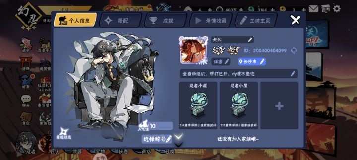 本账号主要挂机,有时候深渊家族缺人会去顶替一下一般深渊都是挂机,根据家族需要可以开启深渊三献模式,族战只会混箱子脚本会自动进D、C、B、SS悬赏;A+地区蹲满后就会进家族、好友拉的A悬赏;S+地区蹲满后就会进家族、好友拉的S悬赏;藏宝图帮打已开;一般可能晚上6点后挂机;拉了不进要么在打活动,要么在完成固定任务。