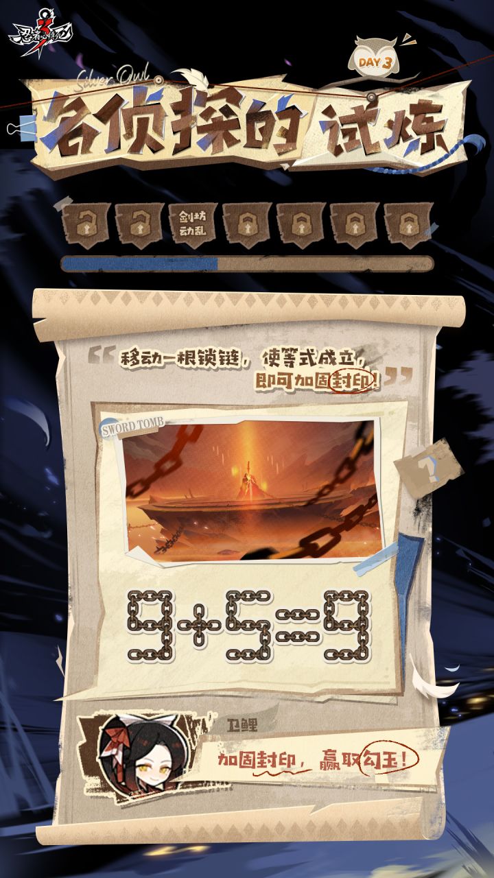 (活动已开奖)1月24日~1月30日,为期一周的「推理主题活动」正式开启!迷雾笼罩的忍界十字街坐落着一家推理俱乐部,银枭、隼白两名创始人正在筹备招生计划……为了甄选全能侦探,他们准备了有趣的谜题等待忍忍们前来挑战,完成推理,有机会获得勾玉~今日关卡:剑坊动乱!【参与方式】step1:保存图片,仅移动一根锁链,使等式成立;step2:将推理完毕后的图片发送至评论区,并附上自己的uid,