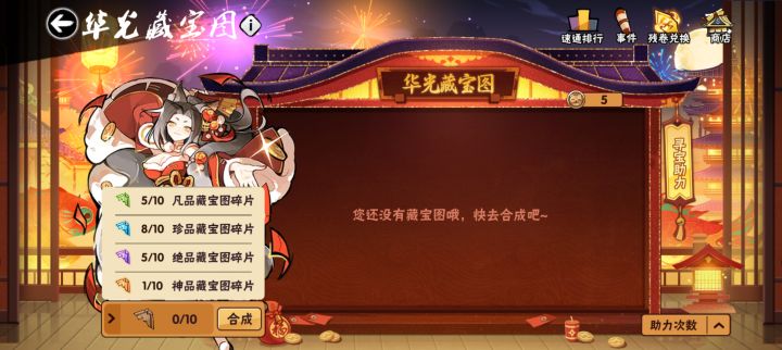 本次藏宝图6500勾玉成功拿下2通1核心专!具体策略就是保证每天刷新4次商店,遇到绝成品、3绝碎片必买,神成品看情况买,在活动中期的时候用藏宝图计算器去预测碎片。由于这是回游后第一次做藏宝图活动,还是有一些不足的,比如还留了5张绝碎片、7张珍碎片,在活动快结束的时候才注意到计算器的碎片预测功能,不然还能省勾玉。