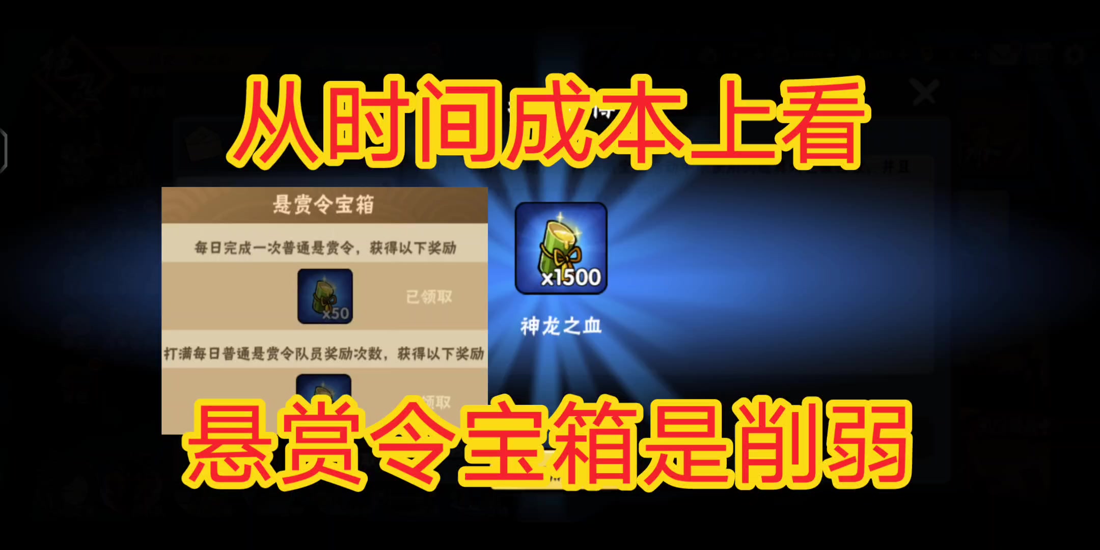 200龙血悬赏令宝箱从时间成本上来说是削弱。 35+25=60/2=30*3=90 15+22=37/2=18.5*4=74 10+15=25/2=12.5*5=62.5 5+8=13/2=6.5*5=32.5 90+74+62.5+32.5=259/30=8.63 90+74+62.5+32.5+200=459/70=6.55