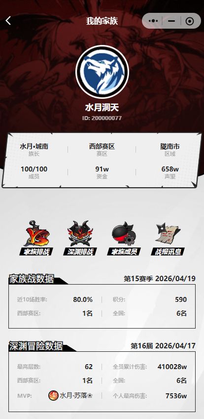 🎁家族福利: 每周都会发车带周常,深渊拉满即可上车,常驻高配沙漏号可帮忙刷魁,每周都会抽人帮助剧情、竞技场等,不定时会有更多福利掉落。✨家族概况: 主深渊,族战稳联赛,深渊百强,深渊62+🎈家族要求: 要能常参加深渊,一个月最多请假1次,其它时候需要拉满,拉满伤害能到达4000w以上,族战不要求,可自愿参加。🎉诚挚欢迎各位大佬以及活跃忍忍。如果您有意向加入我们,欢迎前来了解。