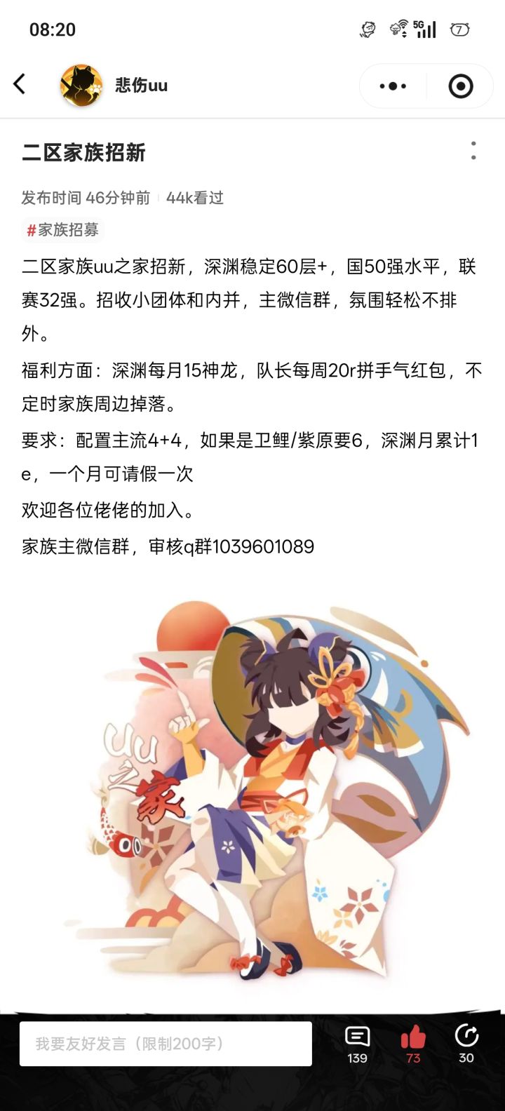 天权活动结束,深渊新赛季已经开启!赛季初人员流动较大,审核标准也会适当降低!流浪猫时刻欢迎新鲜血液的加入,一起冲击更高的成绩! 家族情况: 深渊前百,59层左右,族战中部前十! 天权活动前百!招人要求:常驻常驻常驻! 以下满足一到二条即可 ① 33熟练危险,噩梦或以上 ② 团本大佬,或者有一定基础的团本练习生 ③ 深渊大佬(能稳定参加) ④ 水群狂魔,善良温暖的小可爱 审核群:95