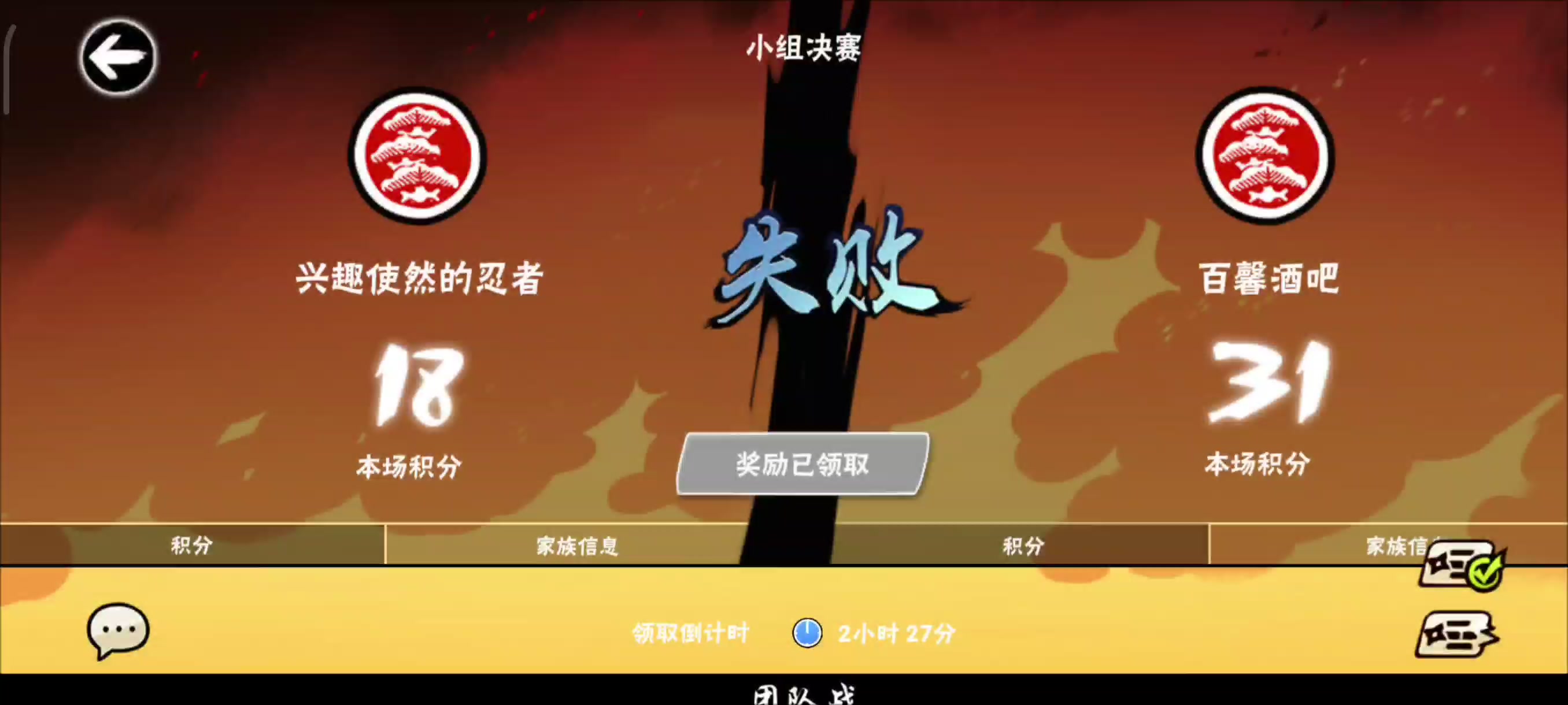 今晚属实可惜,在团本全部放弃的情况下,能打出惜败的战绩很不容易,即便终究还是止步在了32强! 辛苦家族每一个成员的付出,在联赛期间,积极组队进行内战,努力打好搭配,为每一场对战做出努力。 虽然战败,但家族的团结氛围难能可贵,下个赛季一起加油! 明天起,放假了! 接下来插播广告,兴趣使然的忍者(2835)家族招人。 双修家族,深渊前百,族战32强,福利红包多多! 要求: 1. 高顶配官服号优先 2.