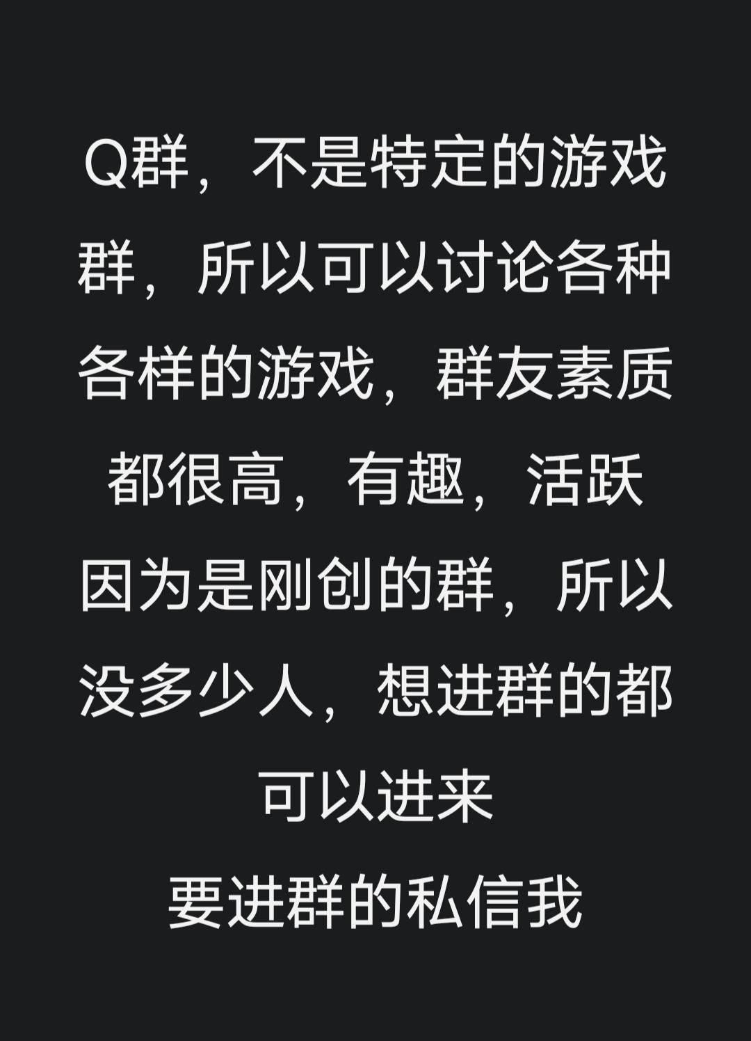 Q群,不是特定的游戏群,所以可以讨论各种各样的游戏,群友素质都很高,有趣,活跃因为是刚创的群,所以没多少人,想进群的都可以进来要进群的私信我