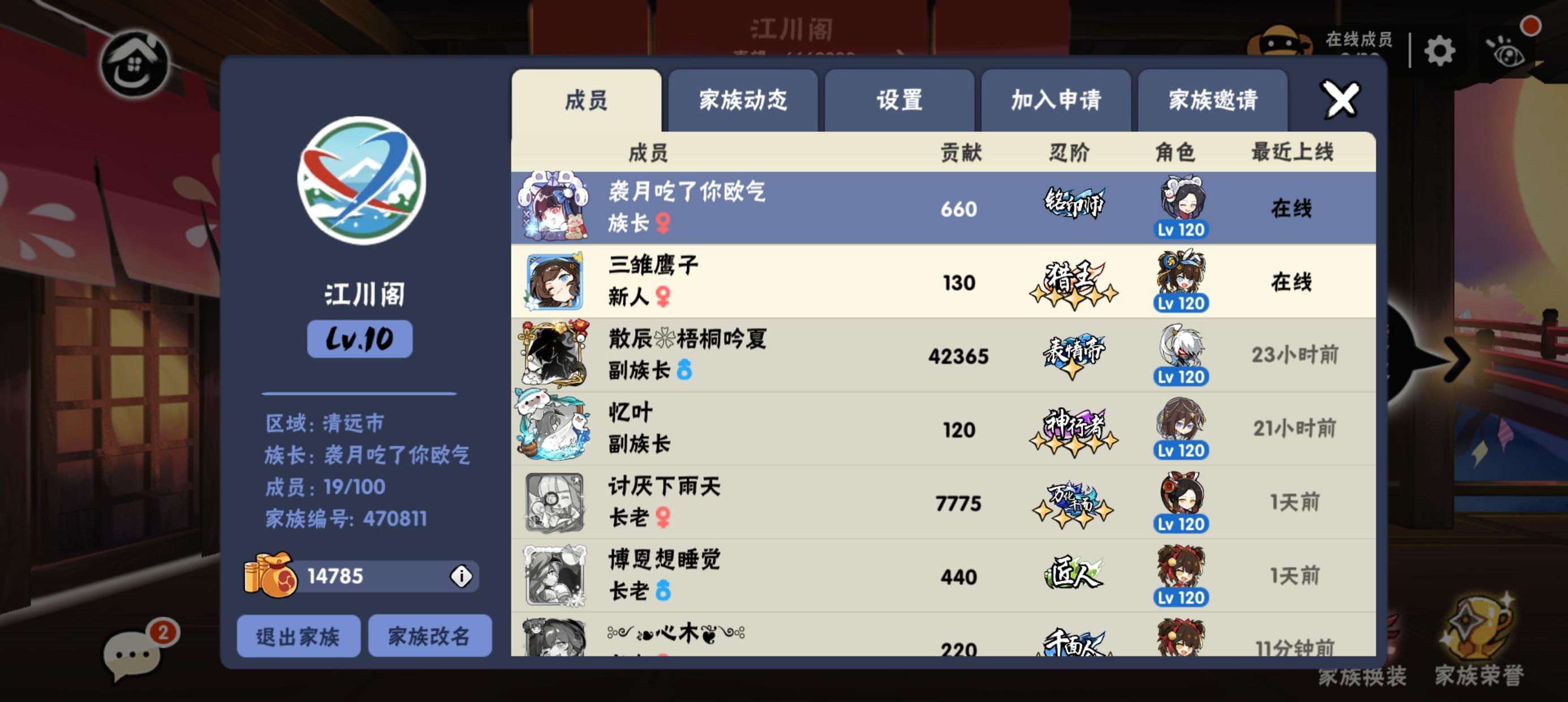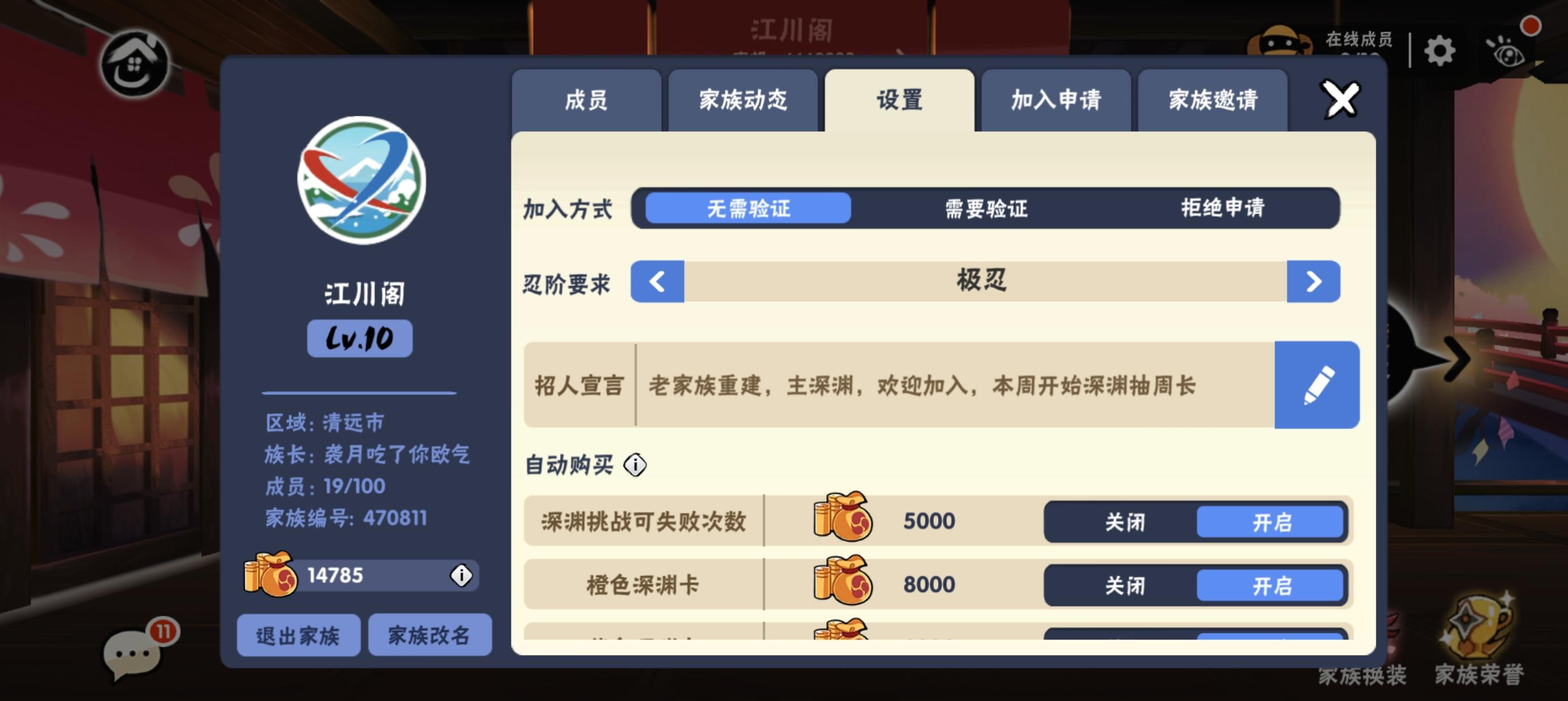 深渊稳定51➕,族战赛区40徘徊,无深渊/族战强制,每周抽周常竞技场,高配免费打天元前千,忍阶不限,活跃即可,欢迎活跃忍忍来玩审核群:777809827 10级家族,气氛超活跃,欢迎小团体,团本危险噩梦无双佬加入同乐!(๑•ㅂ•)و✧ 审核群:777809827