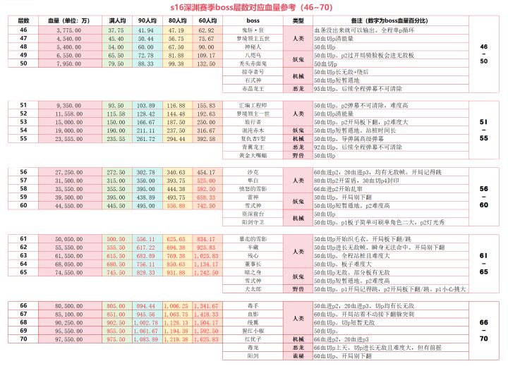 s16深渊赛季boss层数对应血量参考(46~70)