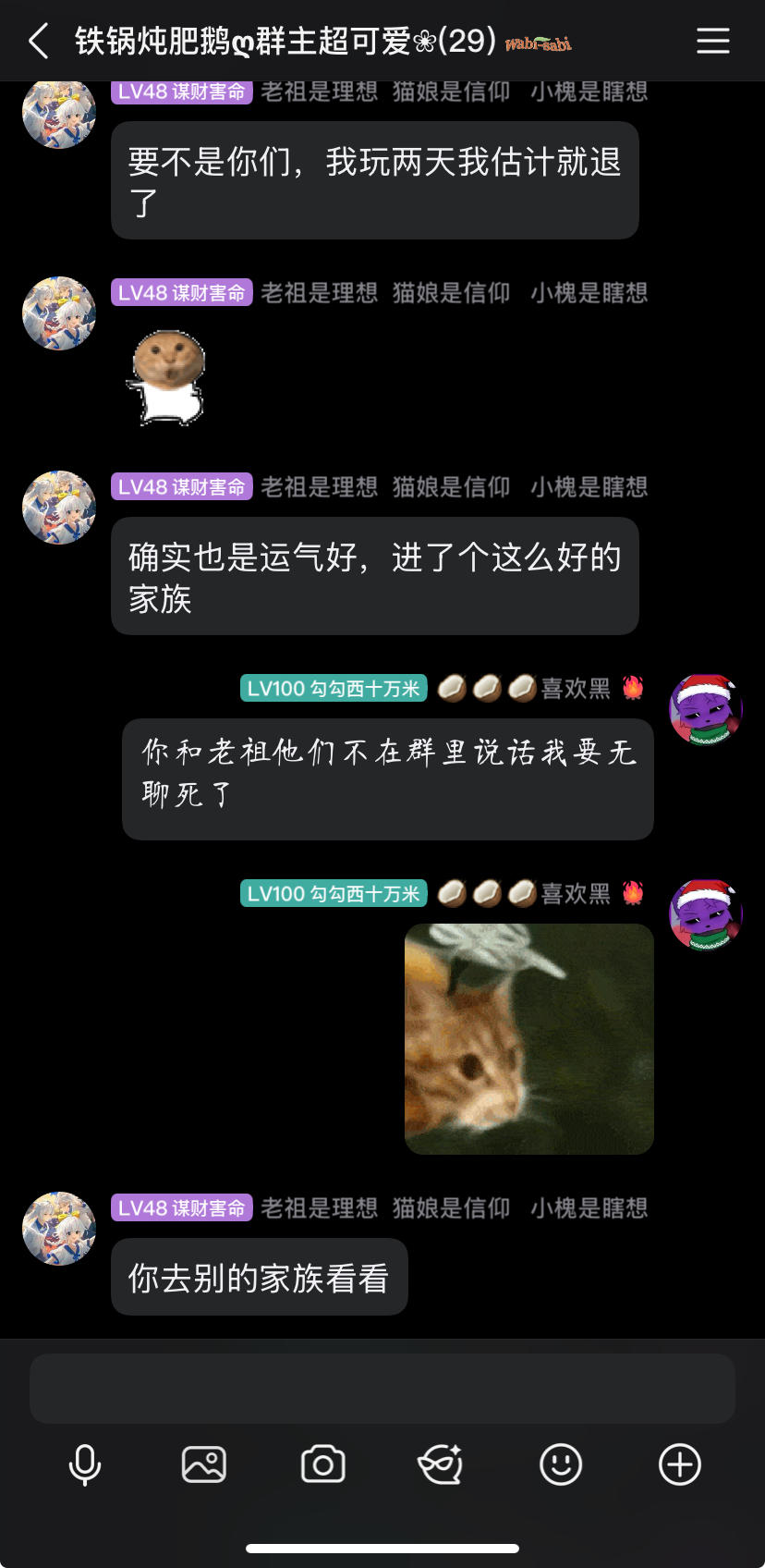 大周日休息的晚上,耐心开导成绩垫底要劝退的族员两个小时•̩̩̩̩ᯅ•̩̩̩!,自问做不到!这不是幼儿园大班,如果我有时间和情意,我带你成长,那没时间呢,耽误其他99个人,大家一起坐牢吗😄,对你公平那对其他努力的人呢!你去单位应聘,几周试用期不达标,老板辞退你你赖老板没带你成长,但是老板可以选个经验丰富的人吧,本来就是互相选择的地方,你选家族,家族选你,你觉得这个家族哪里不好你要走,谁也拦不了你,家
