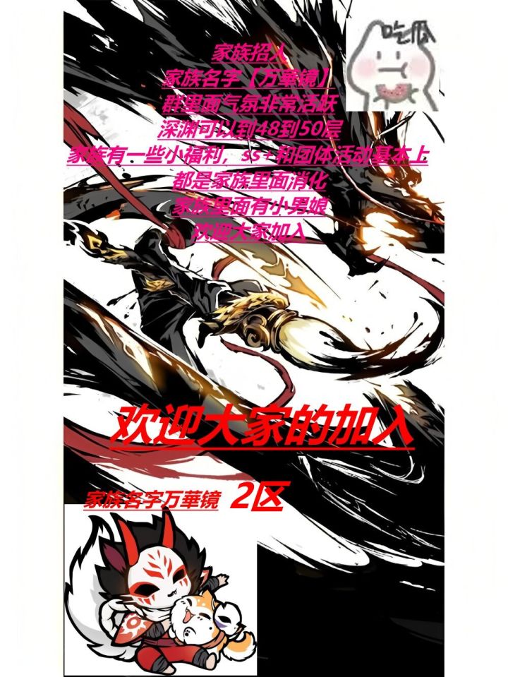 一区族战家族枫铃溪涧,家族目前主攻族战,本届联赛十六强常驻七级战场。家族福利:深渊前十包周高配包无双天元活动千框顶配在上述情况的同时号主可自行提要求配置够都行每周深渊族战都会发放随机红包周四随机请人吃kfc招人欢迎小团体加入家族常驻七级战场,欢迎危险大爪子,噩梦、无双练习生,团本练习生,大爪子加入 我们有一双善于发现的眼睛👁️👁️深渊60层左右,会排表与通知,要求主流忍者
