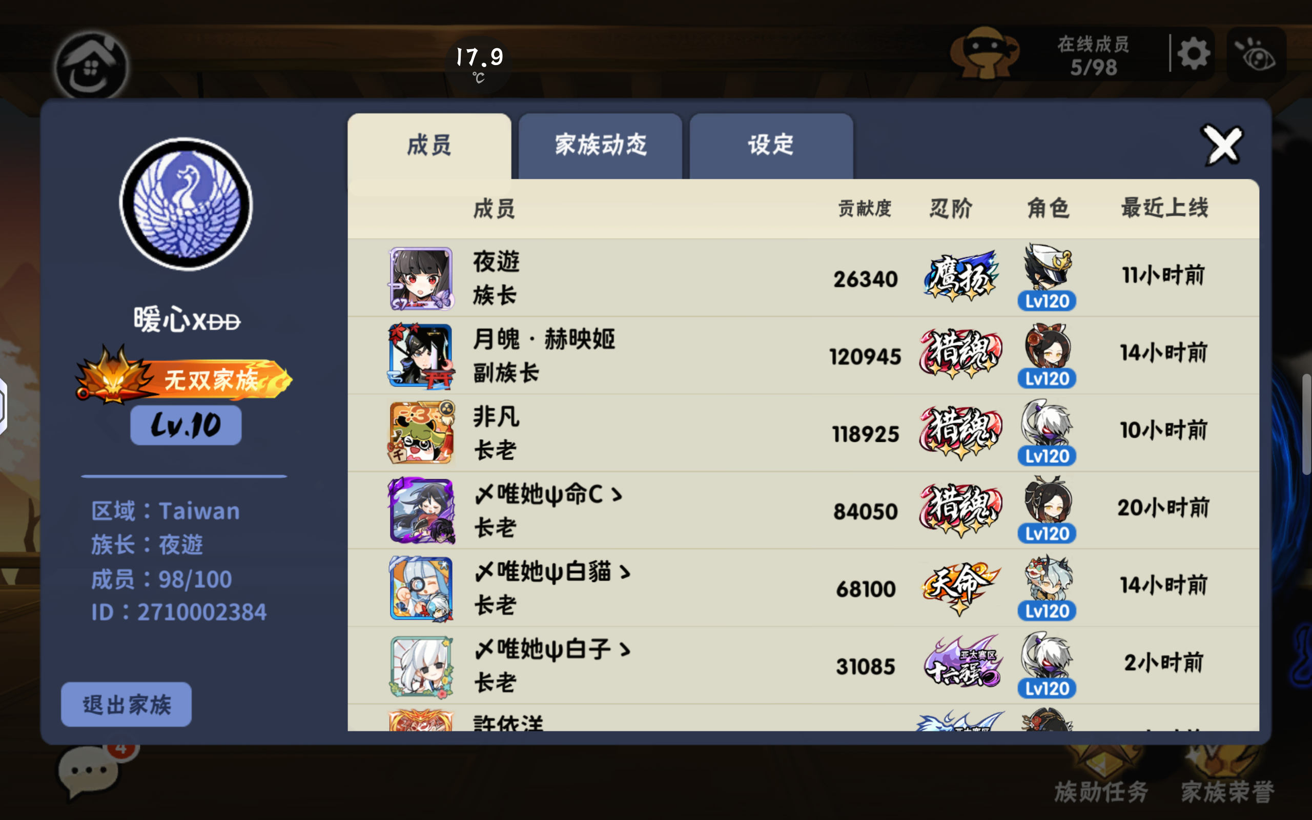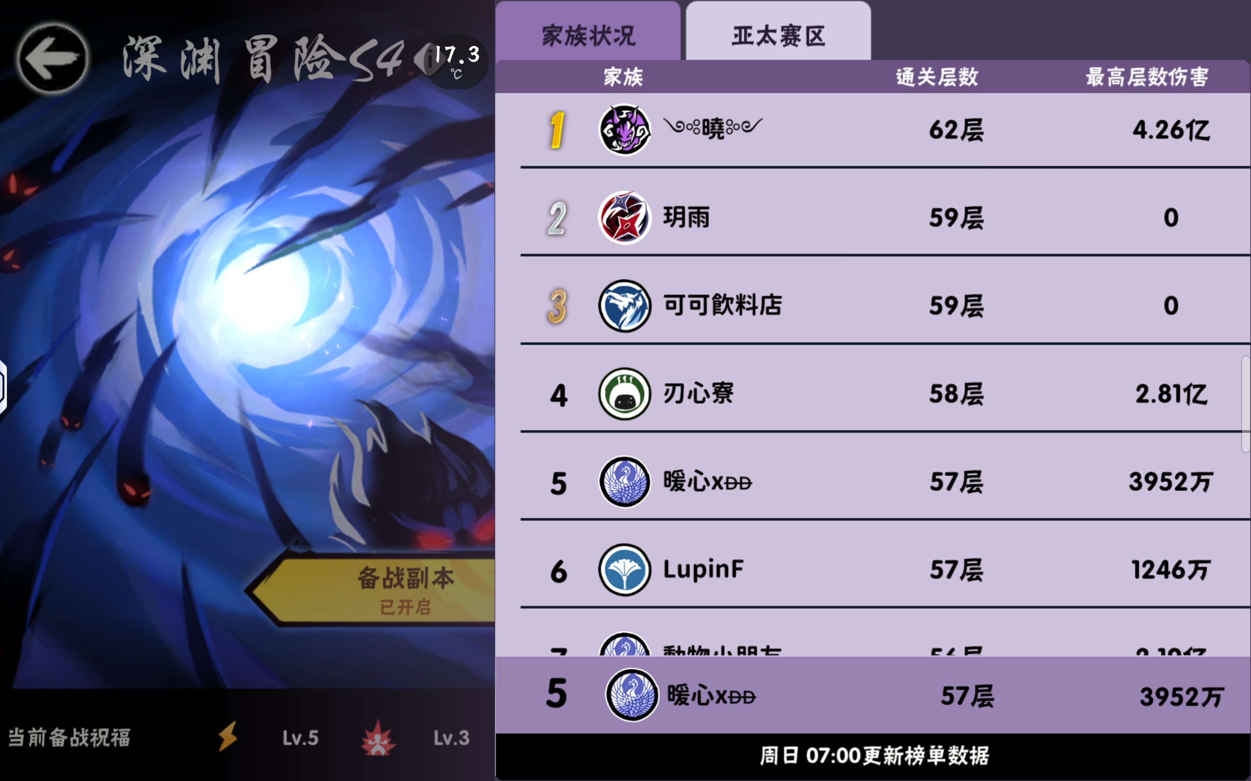 家族「暖心」 赛区:亚太 最高排名:3 目前排名:3 深渊层数:57 招收活跃玩家 大佬 及各类小团体 ———————————————— 招生标准 团本玩家(7选3)要求 逃离森林2400+/树灵135+/ 西瓜315+/河豚190+/飞镖340+/蝙蝠455/新金币3000+ 深渊玩家要求 输出至少1500万 族战玩家要求 会带卡和沟通 困难图与危险图