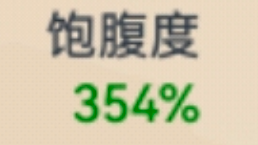 这几天伊洛纳的服务器不是卡的要死吗,我发现现在如果手速快可以在吃饱的情况下再继续吃属性肉和蛋糕之类的食物,这是我一口气吃了五块烹饪好的属性肉之后的饱腹值 话说饱腹值下降的真慢啊,萌新刷了两个会加快变饿的以太病,结果还是很难下降的饱腹值 另外感谢这位大佬,他站在我城镇里,一个咸鱼丢出去就把那么大一只年兽秒了
