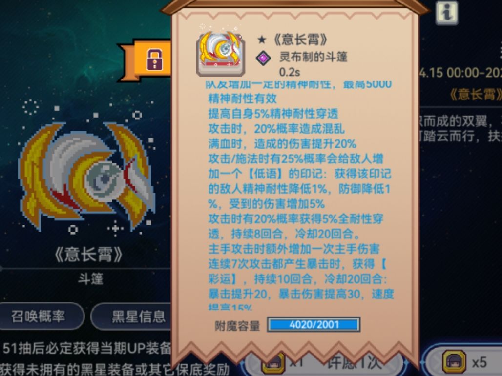 其实本来不会写的,因为最近不是很想肝,妹币相当紧缺。但是抱着“就点十发应该不会出吧”的想法点了十发,出了。所以水一帖。 画风还是一如既往的雌小鬼啊...雌小鬼大家族。 先看天赋。 先是耐穿天赋。58%+25%+40%,不带新暗影耐穿秘宝都有123%,相当可观的耐穿了。新的耐穿秘宝要抽宝库,抽四个也只有12%,嗯... 40%概率触发法术是矢,触发啥靠roll,且单角色单回合单次。如果要搞特效流还是