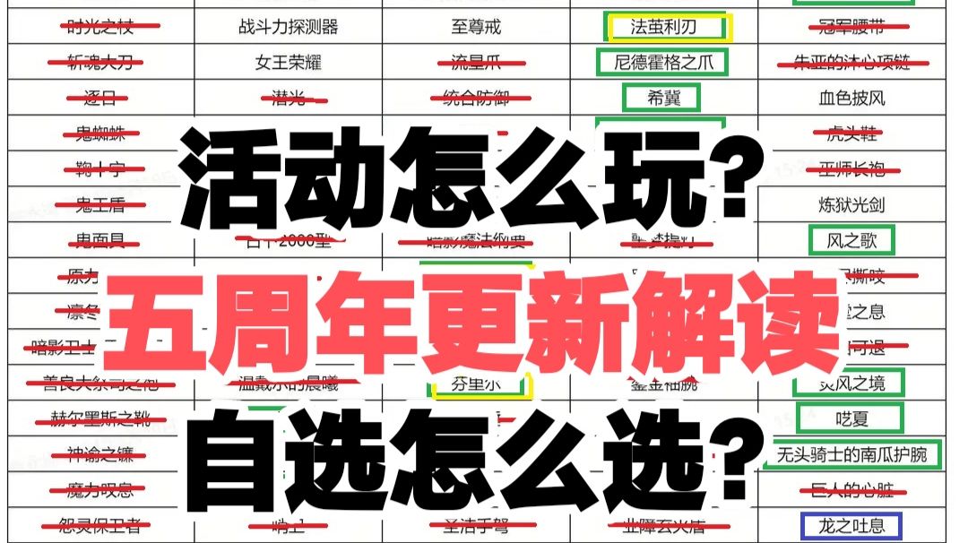 前言:本期攻略是周年庆详解下篇——活动攻略,希望能够帮到大家更好的了解本次周年庆。 本人将分上、中、下三篇长贴逐条分析本次五周年更新: 上:周年庆福利详解→ 中:周年庆新内容详解→ 下:周年庆活动建议详解→(本篇) 废话不多说,首先是大家最关心的如何选自选: 图例: 红色划掉的装备代表一般情况下不推荐自选选择该黑星 (除非没有其他可选,想补个全空许愿池。但是伊洛纳全空许愿池没什么用反而会让你以后失