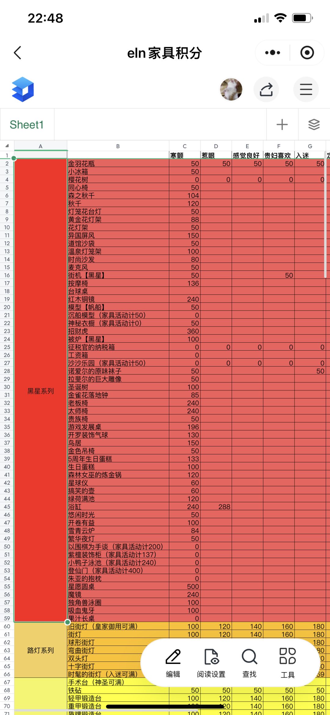 刀木大佬的家具帖子: https://www.taptap.cn/moment/404738312041926441?utm_medium=share&utm_source=copy&share_id=9001ADC94BA4 我的家具积分表: 【金山文档 | WPS云文档】 eln家具积分 https://kdocs.cn/l/cjMC0g2GU6Wy 注:女仆那里的家具积分和活动里的家具积分不