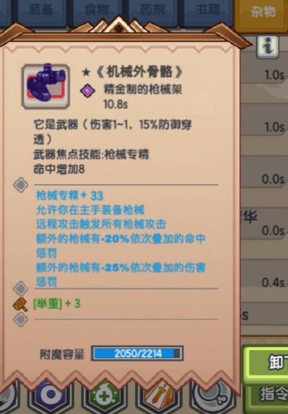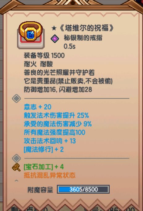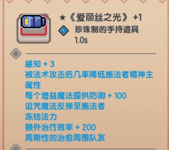 ★《时沙之隙》 玻璃制的手持道具 0.4s 装备等级1500 耐火 耐酸 时间,总是在不经意间溜走 它是贵重物品(禁止贩卖,不会被偷) 伤害追加28 防御增加127,闪避增加284 速度+4 攻击10%概率获得忍耐祝福 忍耐祝福持续时间延长100% 每层忍耐祝福增加10%法术伤害 攻击法术小几率触发时间暂停[400] 物理伤害对生命高于80%的敌人造成的伤害提升200% 造成伤害前记录敌对生物血量
