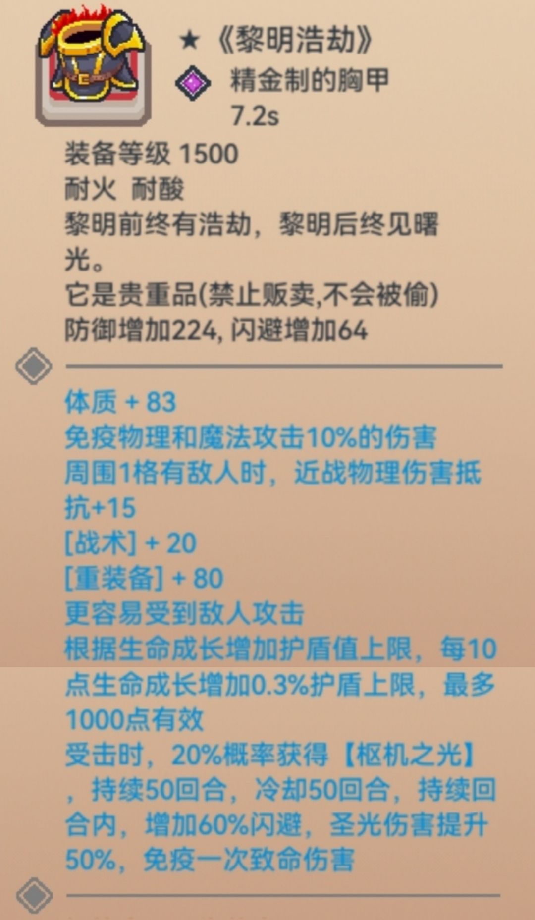 三锤半体质,可以。 10%真免,还行。 这个抵抗其实效果不大,和灵风的那个是一个东西。 一锤战术,四锤重装,现在这个版本聊胜于无了,对新人有些用。 更容易受到敌人攻击...应该是一个嘲讽类效果。 吃满30%盾,这个还是有含金量的。 重点buff。大概一半回合续航的单次免死,还是可以的,但是这个60%是真闪,会对你的输出期望造成一定影响。如果挂地宫这种不追求极限的情况,带上有所帮助,攻坚环节还是下了