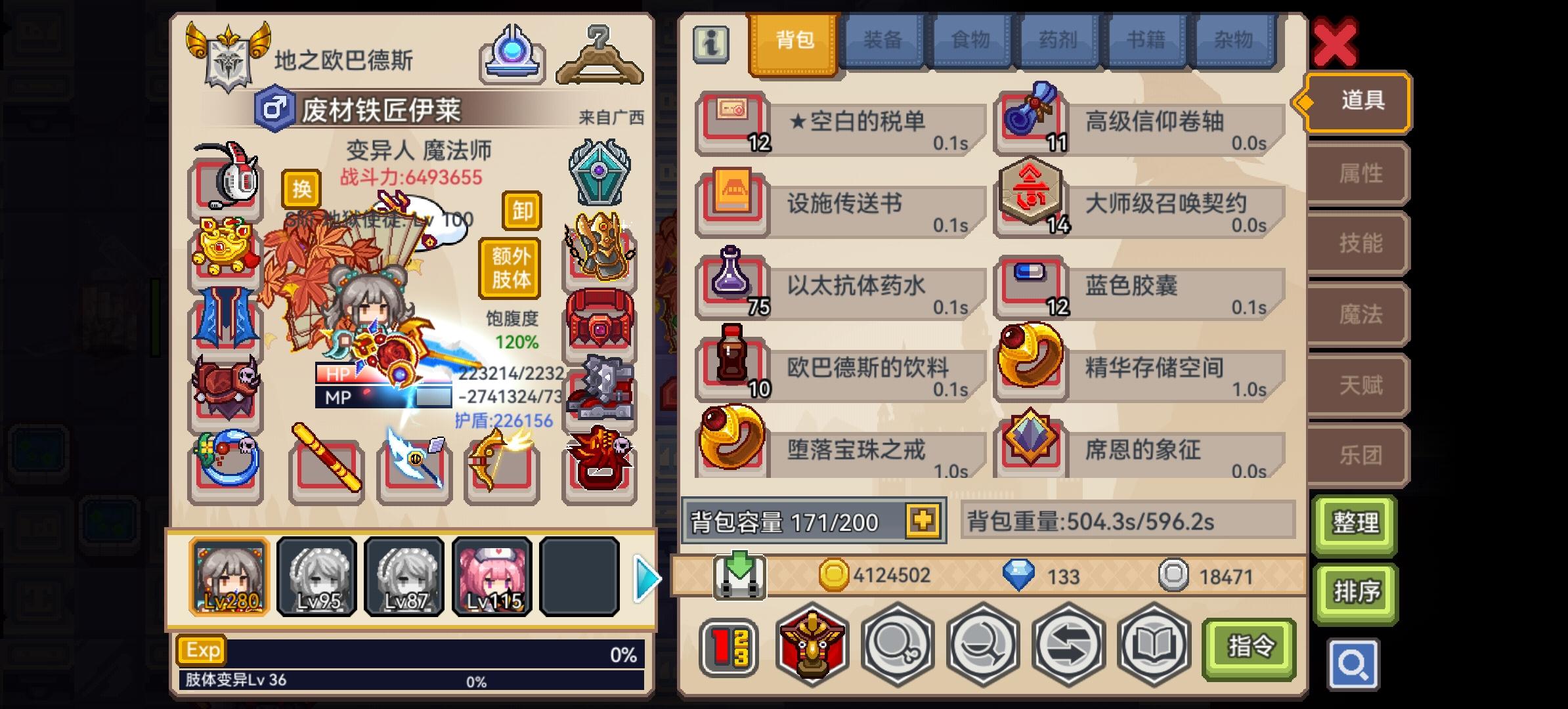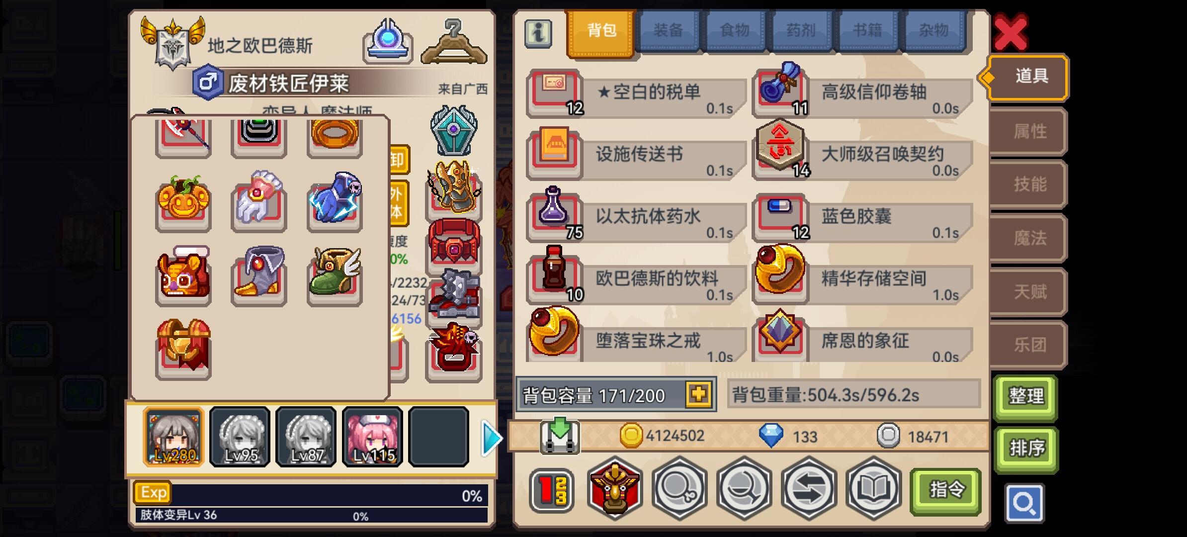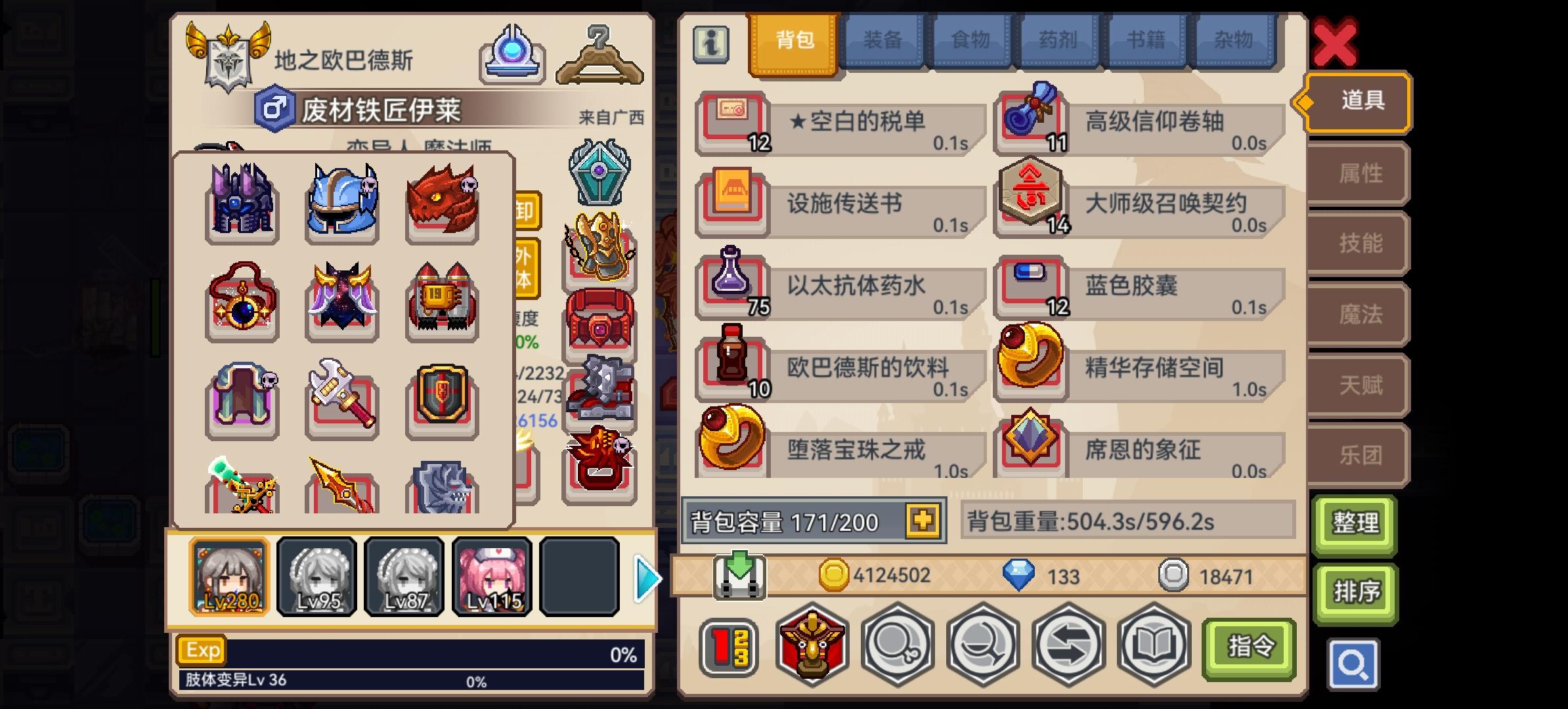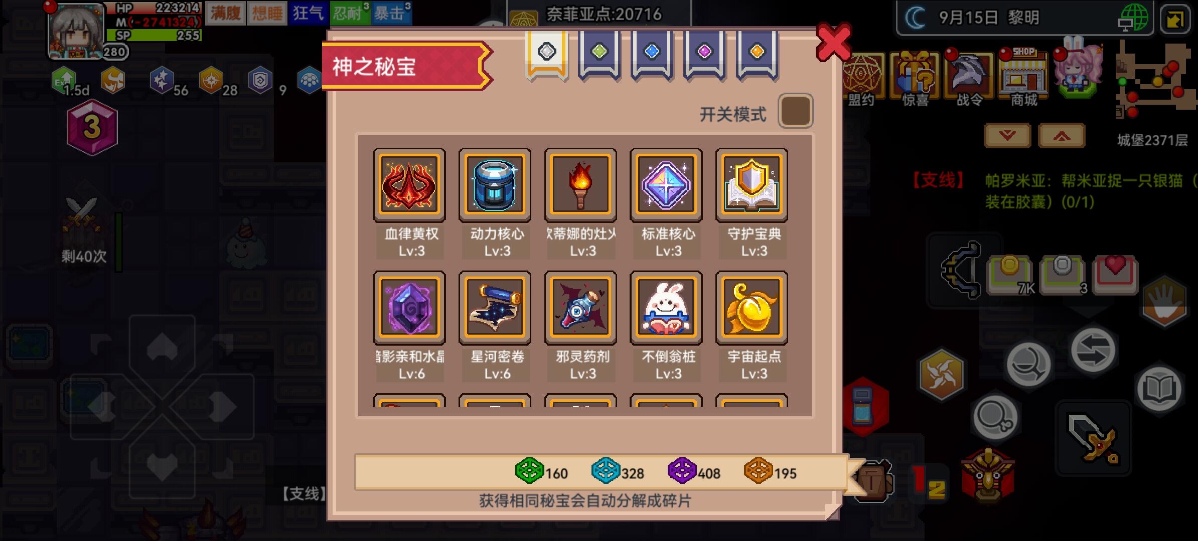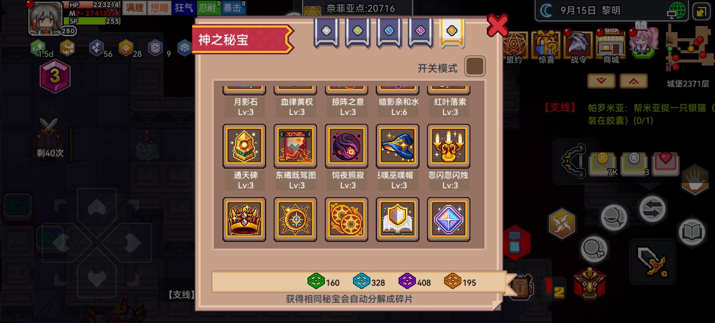抽了神器抽了个枪和三尺,目前耐性吃满,卡在800层左右,听大佬们改了魔免和物免追击,目前物免50%,魔免38%依旧900层被巫妖螺旋王一脚踹死,秘宝有个3级的星河,也是听大佬换的,能够保底出一个自选,听听建议。#伊洛纳萌新疑