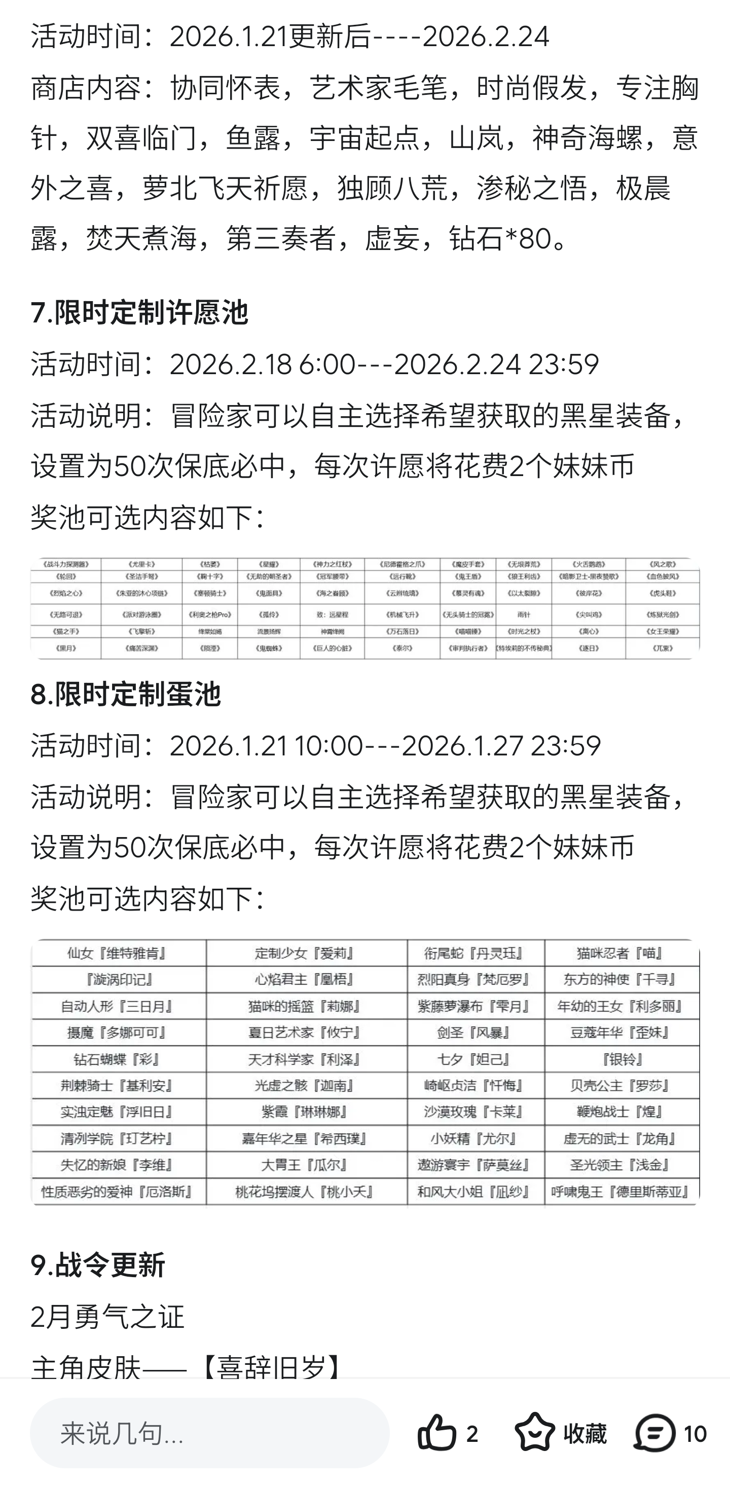 亲爱的冒险家:为保证伊尔瓦世界稳定运转,我们将于2026年1月21日09:00——2026年1月21日12:00进行停服维护,维护期间将无法登录游戏,请各位冒险家提前做好准备,以避免不必要的损失!【版本活动日历】冒险家们,异世界好友再相遇!伊洛纳春节二次联动开罗版本!「敲罗打鼓,伊起过年」重磅来袭!请收藏好日历,不要错过精彩内容哦~【版本新增内容】1.新增里神-幸运的爱赫卡托尔里神介绍