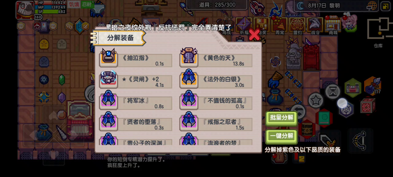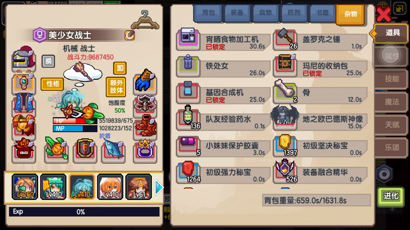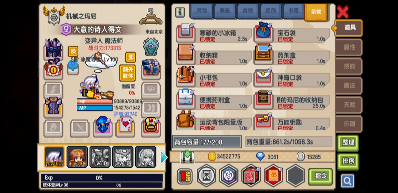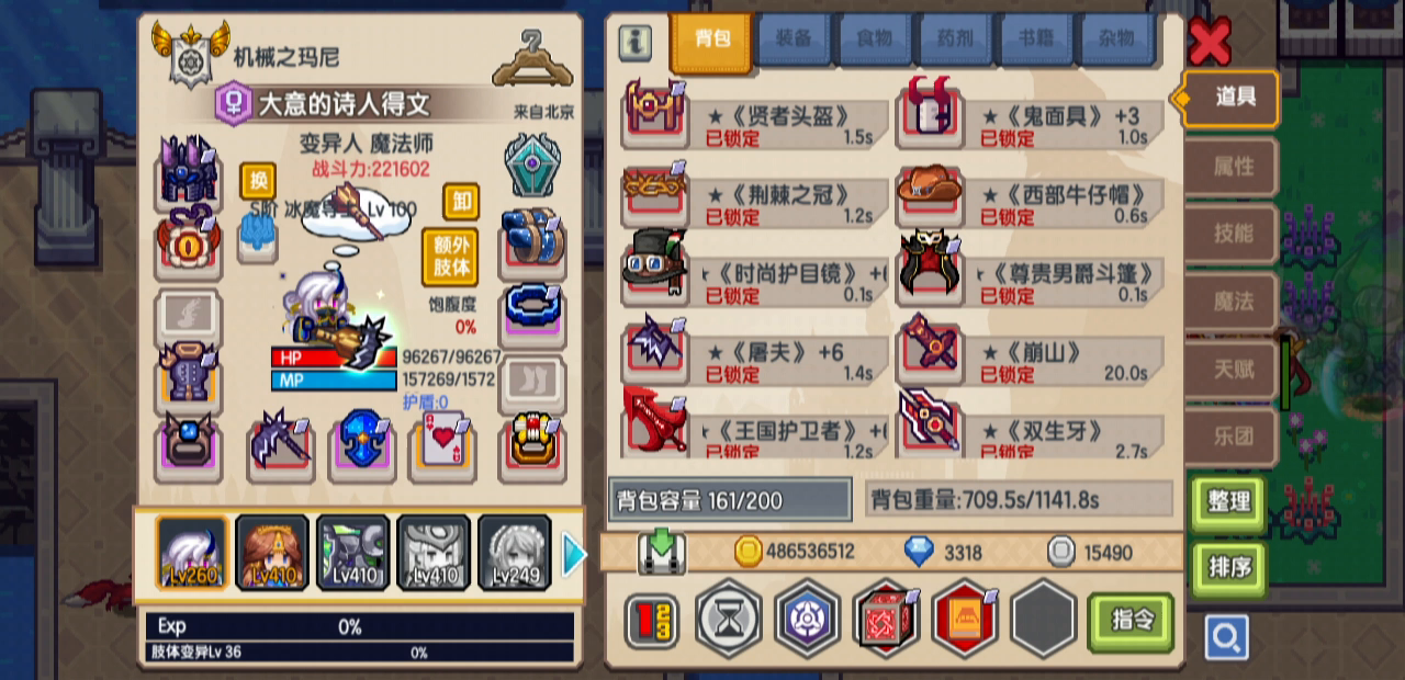 穿的都是必要的装备,主要是堆真免魔免小免格挡法档,个人感觉用冰法挂机和大剑差不太多,主要是有个免死的后备保护,太阳骑士也同理但是会打断挂机状态,不太好。 剩11个空位,可以开始准备做采集套了