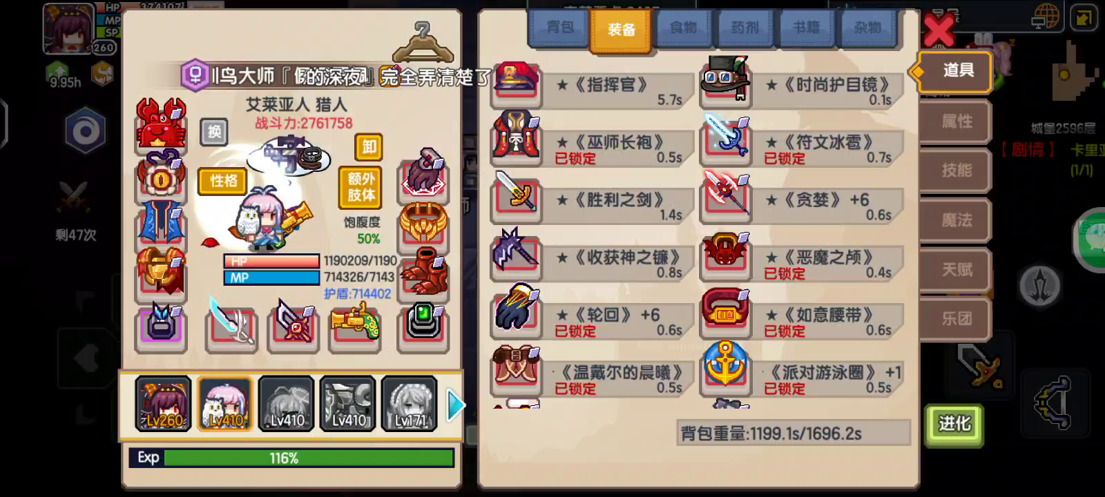 接下来是漫长的盟约等待。。。 第一个本体也输出,幻沙挂头上当吉祥物,带了巫妖头和轮回之后好像确实能活了。第二个换成远程,发现自己本体好像能随便挂啊,幻沙莫名其妙暴毙了应该是输出问题,不研究了等盟约点完耐穿再对比一下。 五百下四没有压速,总结看来得本体2399才不算萌新