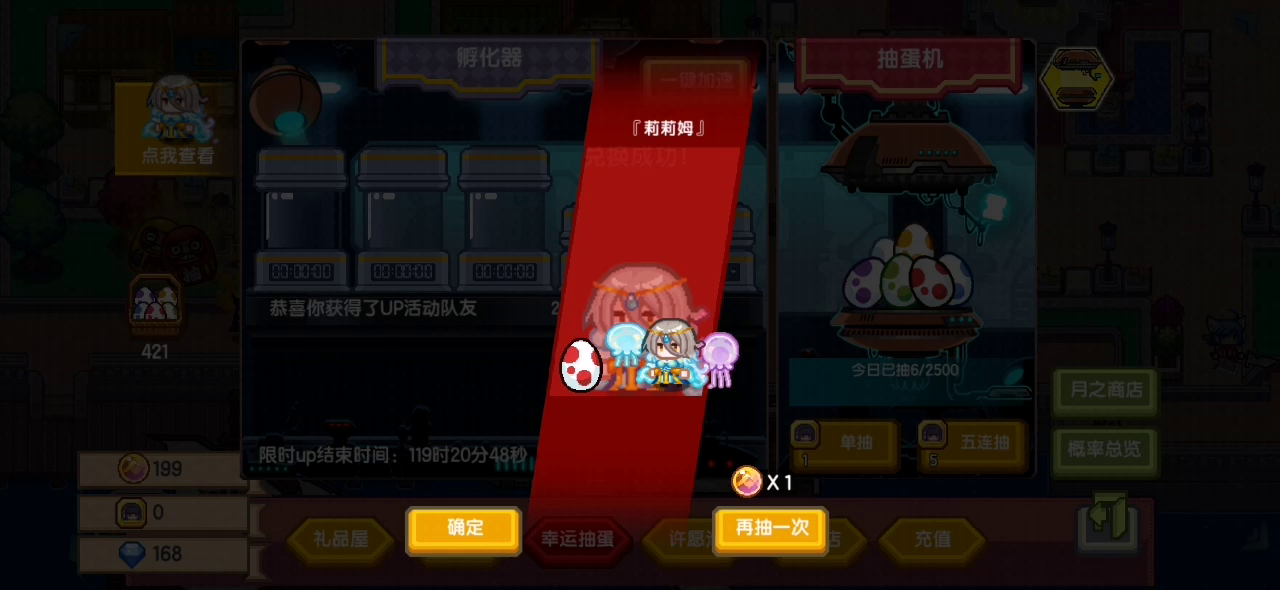 第一天攒的80多币加130钻,90多抽既没有水母也没有兔子,吐了,卸了,又下回来了(想起来还有10多个钻石袋没用),赌了,赔了。第二天,6yuan2币15钻,打工钻袋和4天分享10钻,再来5发,没有,108了。第三天,“氪”服困难吧,拉到保底,提前出了。 出时有点开心,但想了想,又觉得很亏,倘若130保底,更亏,很矛盾啊😥