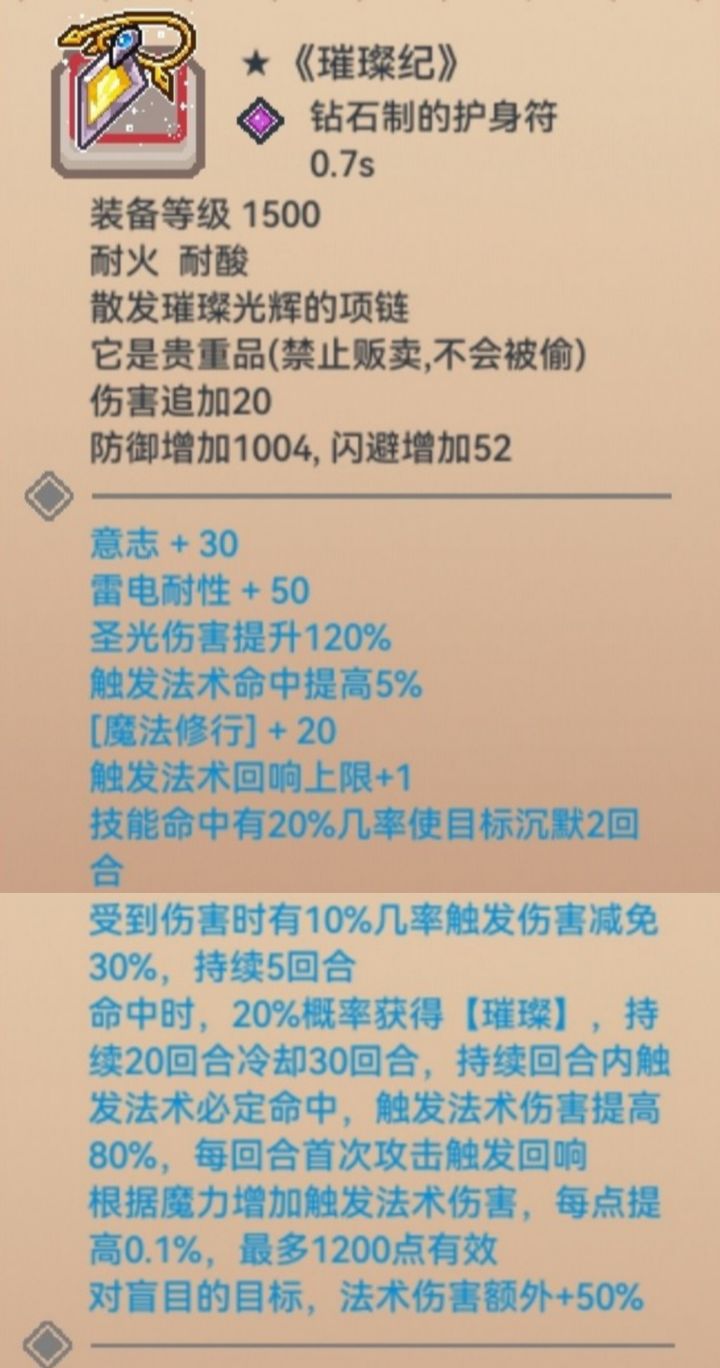 一条意志,聊胜于无。120%圣光伤害...吃得到就吃吧(一条魔法修行,聊胜于无。触发法术回响上限,可以加成法刀与奇袭。命中沉默,暂时没有描述,猜测为下图。受到伤害触发伤害减免,暂时没触发过,不过本身词条覆盖率太低导致强度不高。璀璨,需要物理攻击触发。不是哥们,又没有描述,图标也复用,偷懒了啊。估计之后会换新。增伤也是普通区。魔力增加触发法术伤害,普通区,稀释较大。盲目目标法术伤害+