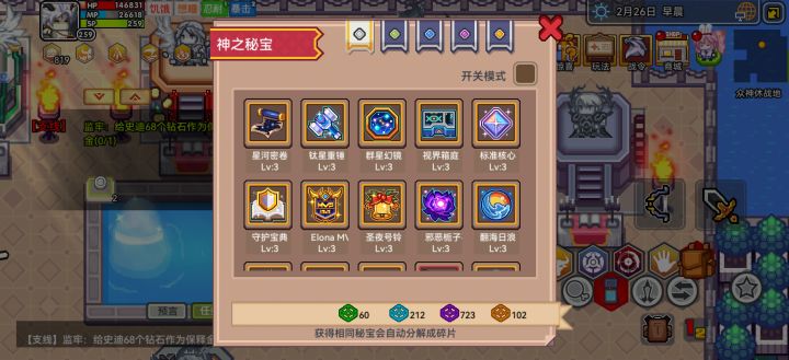 给你说下近期能做的1.杂货店或地宫里,遇到铁处女或断头台,买/捡一个回家,然后不断使用,家里直接复活,降低层数,这样保证刷新出的地宫你都能去打2.家里的女仆每天18点之前和18点之后各能领取一次双倍时间,领取-使用,刷地宫,提高等级,不需要了之后再去冻结上,地宫里,盟约,这个点上,满了就重置3.河灯活动可以购买下生命奶酪(人物-属性-生命,点击查看下,是400潜力再吃)锻造活动这个,你可以...参加下城镇铁匠/神秘商人购买装备再分解,地宫还可以整个混沌地宫-装备,能提高一点拾取数量,活动能参加一点是一点4.招募的宠物有啥用啥,直到,招募到女仆长,有了这个之后队伍里放俩攒钻石,攒妹币,等后续抽黑星,不要乱花