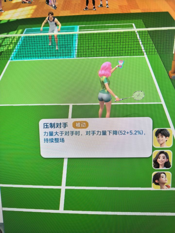 这游戏估计想做各个参数平衡的玩法,但实验下来反应,体力,技巧这些都没用,要想在体力高于自己三四倍的对手局获胜,力量才是唯一有用参数,在五分局甚至前三分都可以输,唯一一个目标就是尽可能的浪费对方体力,因为你力量大,所以对面体力会掉的快,对面体力掉没了你就一直扣杀就行了,前两三分就尽量多接球,接扣杀球就是接完球马上回到中间准备接下一球。教练全上加力量的,力大飞砖就完了!