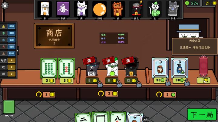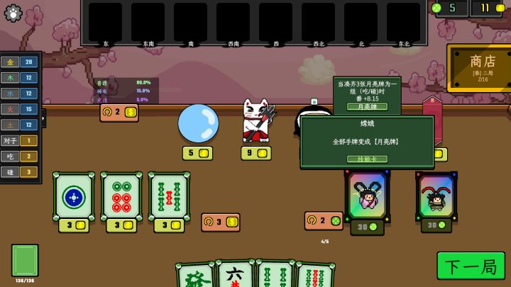 这时候就体现出肉鸽成长的魅力,每一个关卡结束之后我们都会进入商店,在这里有着各种各样的技能卡、化身卡,有了这些卡牌,基本任何我们想修改的东西都能实现。像是麻将的点数,花色以及麻将所携带的分数,甚至是变化麻将所使用的材质,让我们在打出时触发材质所附带的额外特殊效果。