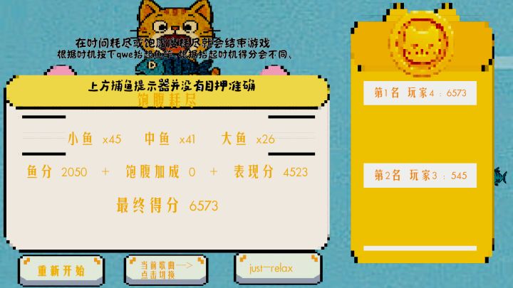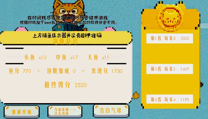 游戏巧妙的将猫吃鱼这个常识通过音游的方式展现出来,通过不同鱼的种类和连续钓起的个数,增加不同的分数,当玩家失误的时候,游戏右边的饱腹值会大幅度降低,饱腹值为0后,游戏直接进入结算界面,玩家可通过钓起鱼来增加小猫的饱腹值,当饱腹值溢出后,过多的饱腹值被当作积分在结算中进行汇总,游戏中有67首知名歌曲可以选择,选择喜欢的歌曲钓着鱼也何尝不是趣事。