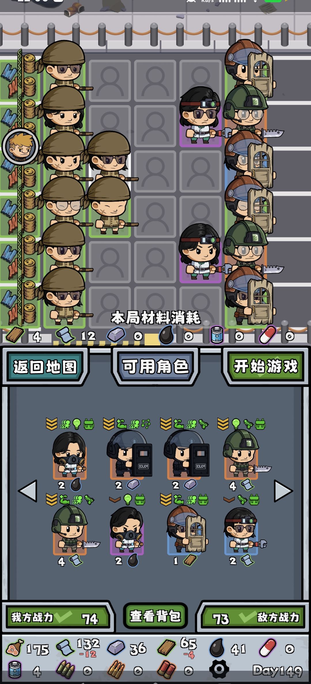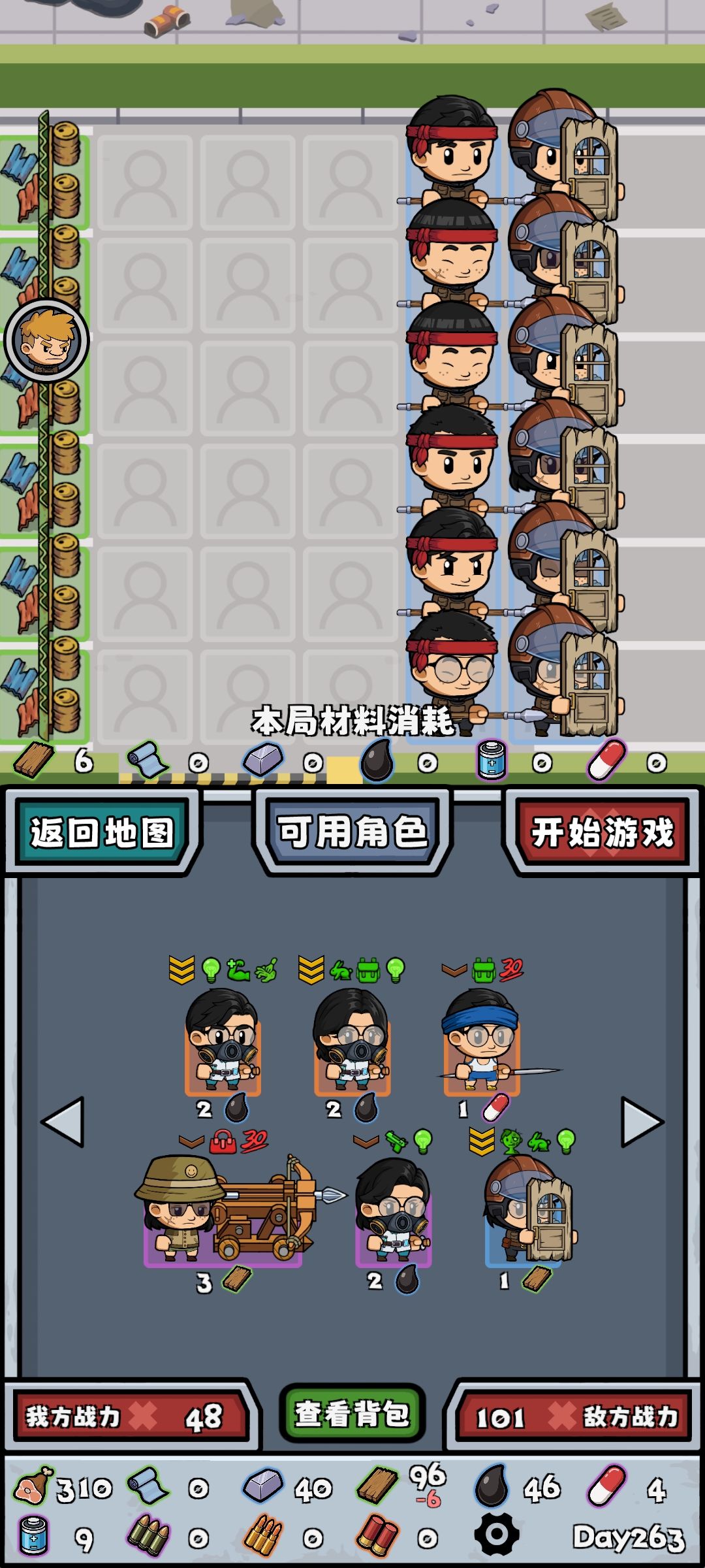 进阶攻略-阵法篇 最佳幸存者数量24-30 这里提一嘴: 半感染者属于是先天的属性,无法通过后天升级获得 以下所有障碍物/门板类幸存者前的幸存者的都默认有“半感染者”属性 1. 低耗无障碍阵法 因为僵尸不会攻击拥有半感染者属性的幸存者(我上图用的不是) 因此可以仅用两个幸存者(可以攻击到上下两路的)无放置障碍通关 (后面一排障碍物是自带的) 2. 侧边阵法 利用可以攻击其他路的幸存者来达