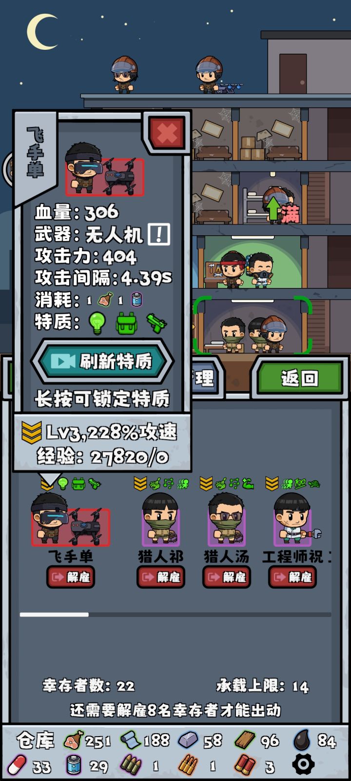 0氪党便宜又好用阵容,只吃食物和木头,门板特性全部带半丧尸,灯泡,兔子,不被怪打攻速拉满,枪兵特性全带乌龟兔子加灯泡,攻击攻速拉满使劲捅就完了,主要是便宜一套下来二百多瓶盖,后面带两药剂师贴着枪兵放就更勇了,打无限也挺猛,放三排,前面两排枪兵要把兔子或者乌龟换成半丧尸不然会被冲垮。野生的门板或者枪兵不要,除非特性刚好,刷特性要看巨多广告,看广告领的瓶盖别乱花两天就妥了,要做完疯医任务