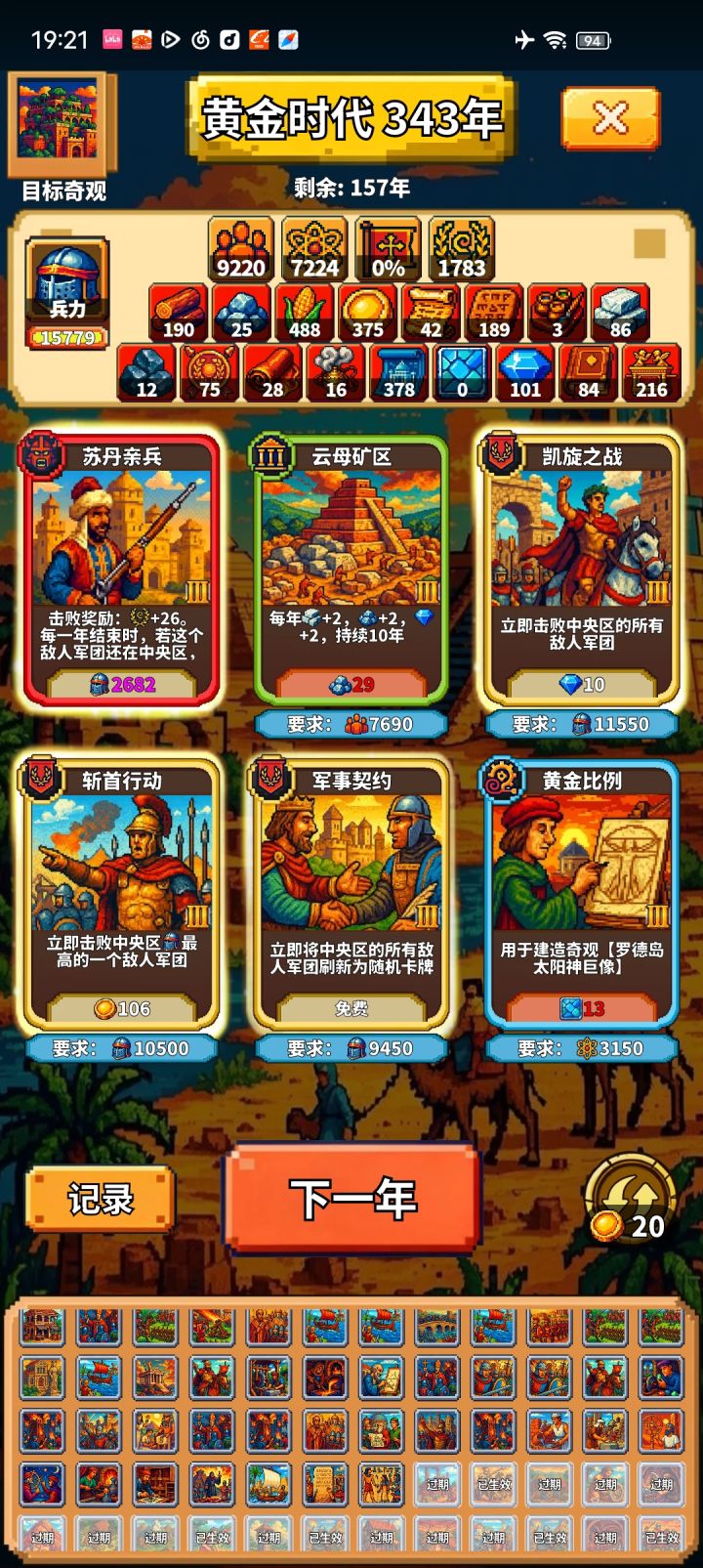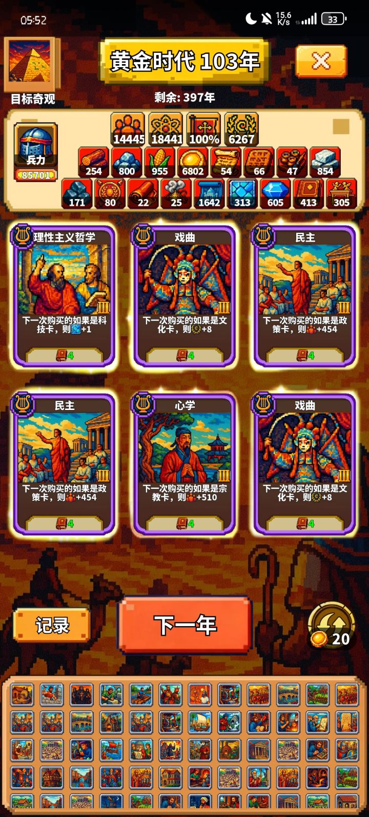 卡池还是会烧光死档。兵力确实有了一些增益卡好很多,起码这波不会死,甚至直接溢出一点。难度方面,如果简单没卡死,我七十年资源分裂出来只有四百左右,一千五还有天差地别。但是我想问,那这资源分裂不是看啥点么,因为金币限制只能点那些。一个资源分裂成多个,没有策略可言,也就是我暂时看不懂玩法,不知道主升什么,也就没有技巧可言,如果单纯按资源和发展时间做难度,明显通关也要个三四百年预计,后续难度根本过不去