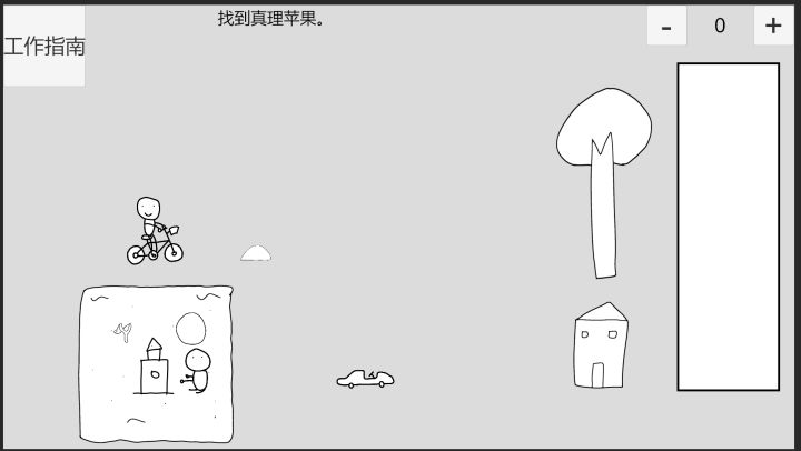 通用流程:图为第一关场景,左边自行车小人会向右行驶飞到半空后落下来,其余物体不动,先收集沙地处的弹弓和弹丸。点击树,树上有三个苹果,其中真理苹果被猫守着,无法获取,下方苹果被挂着无法获取,只能获取上方的苹果2-3.观察苹果2-3,逻辑为:物体受力往右,速度变化方向往右。点击弹弓朝右下角小人射击,再点击箭头推导,此时逻辑为:物体受力往右,无速度变化。来到时间1,将定律苹果附加到自行车小人,