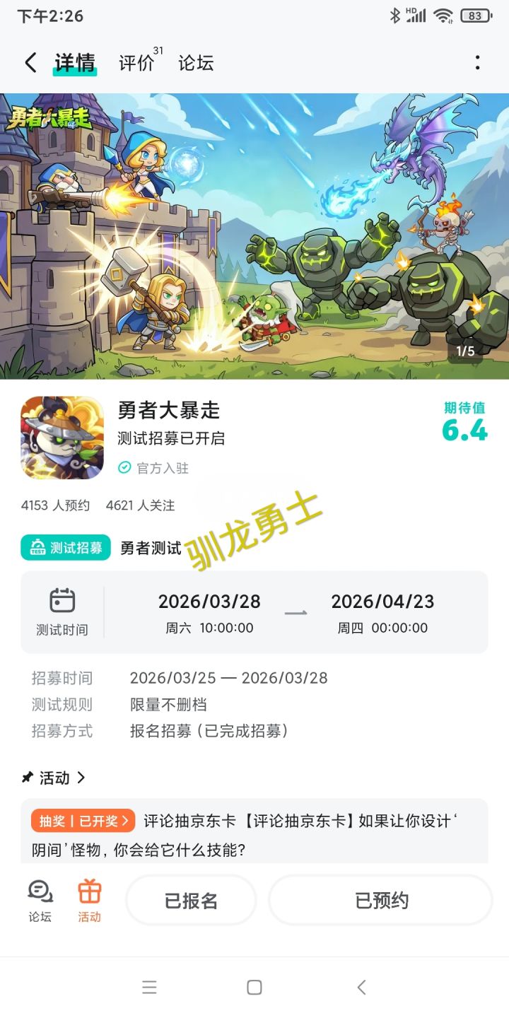 各位勇者好:在上一次测试过去后,收集了很多玩家给到的修改意见和优化调整建议,在做了一次漫长的优化和筛查之后,《勇者大暴走》带着更新走来啦。这次的「勇者测试」报名招募已开启,点击即可参与招募>>>>【参与方式】1.关注《勇者大暴走》且发新帖晒游戏内截图(自带水印)2.在本帖下方评论区分享发帖链接即可【活动时间】即日起~2026年3月31日23:59【活动奖励】京东卡,共3份【注意