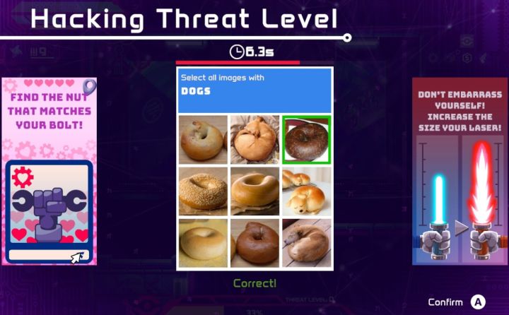 当然这时候就可以发挥我们的黑客优势将这些安全等级给降低回去,这是我觉得最哭笑不得的,进来的解决方法就是各种人机验证,没错就是我们现在常常见到的那种,“让我们来验证一下你是否是人类”的那种验证,九宫格的图片中找到对应类似的图片,这个设定还是挺有新颖感,能在战斗的过程中换换不同的游玩口味。