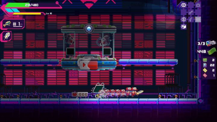 不是,你有见过这么离谱且解压的赛博肉鸽吗?这游戏虽说名字带黑客,但核心体验还是更加偏向于硬核动作,游戏每个关卡的目标是就是找到BOSS的房间并将其击杀,而想要找到这个房间可不是那么简单,密密麻麻大小不一的房间都散布在整个地图中,房间之间有相互连通甚至有的房间连接了不只有一个房间,房间的种类也会出现不同的变化,有可以将收集的物资传送回大本营的运输房,也有挑战获取大量资源的挑战房,当然还有猫猫被囚禁的房间,这肯定是我一定要去拯救的。