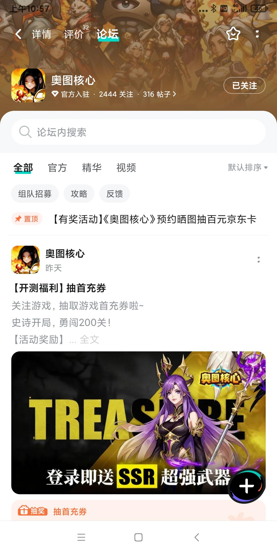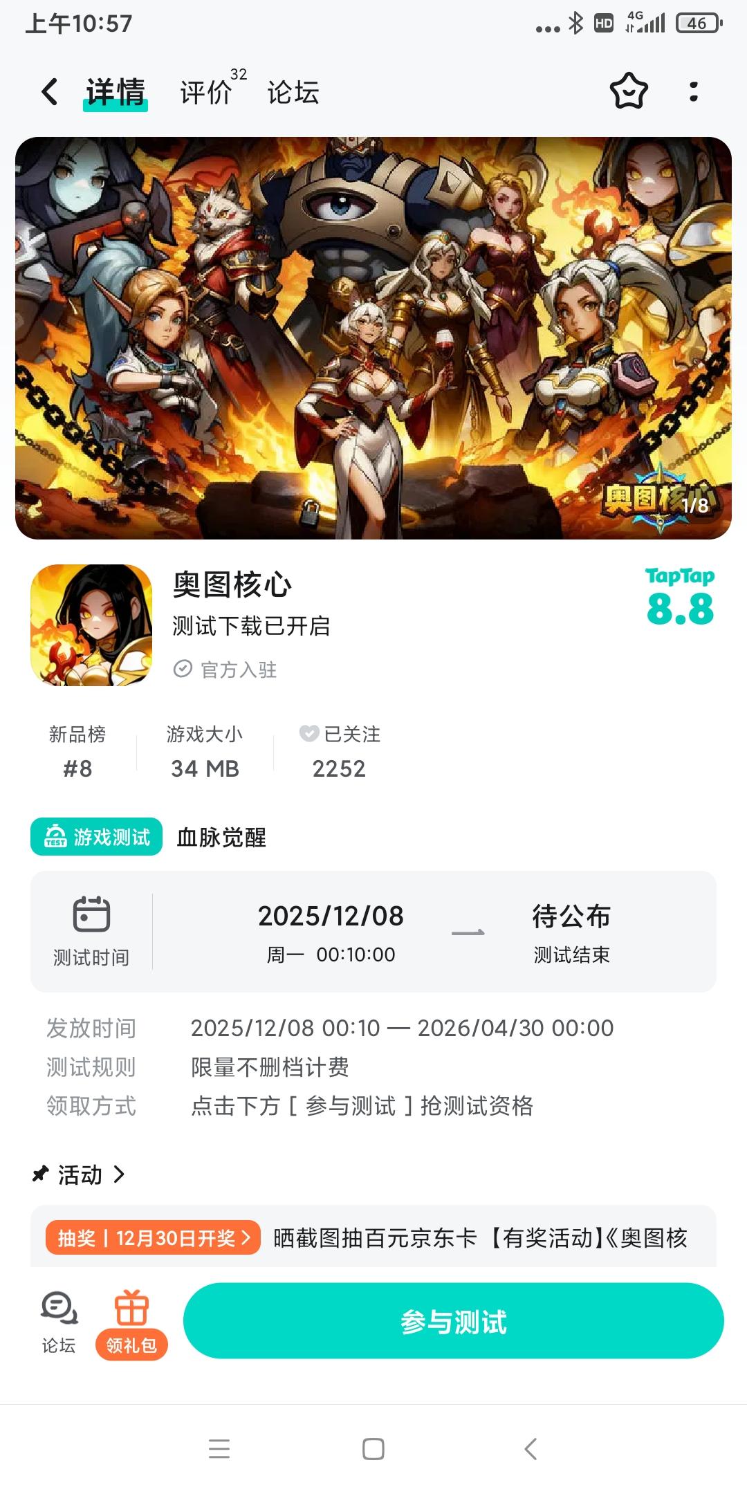 论坛专属活动已启,速来参与赢福利!预约游戏发新帖晒截图,赢百元京东卡!血脉觉醒,破界称王!暗黑西方魔幻rpg《奥图核心》等你来探索!【参与方式】1.点击关注预约《奥图核心》并发新帖晒截图2.在本帖下方评论区分享发帖链接即可【活动时间】即日起至12月25日【活动奖励】随机抽取1名符合参与条件的玩家获得:100元京东卡一张【活动规则】1.内容禁止涉及暴力、色情、政治、恐怖内容,违