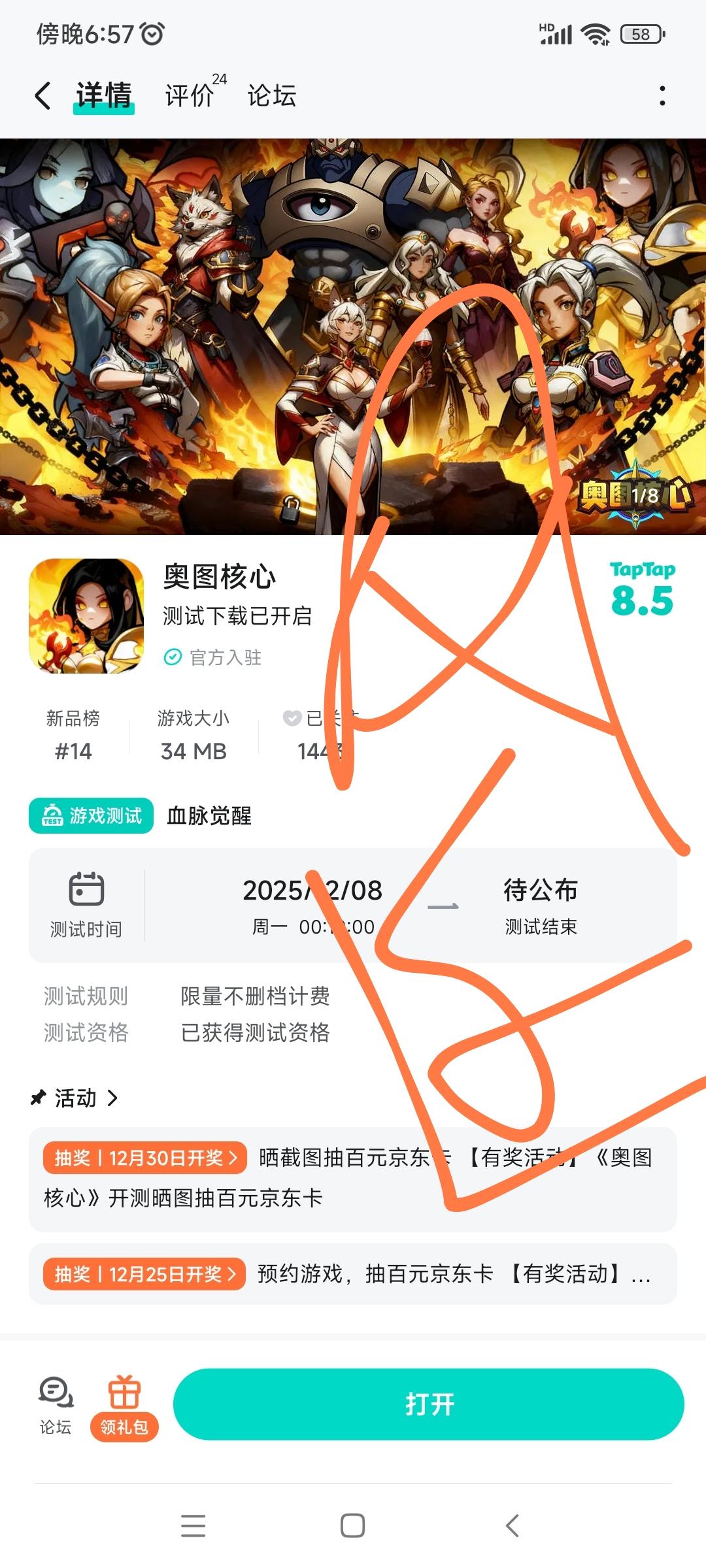 只有强者才能掌控命运,成为真正的冒险传奇。暗黑西方魔幻,RPG手游《奥图核心》即将开测,论坛专属活动已启,速来参与赢福利!发新帖晒截图,赢取百元京东卡好礼【参与方式】1.点击关注《奥图核心》并发新帖晒截图2.在本帖下方评论区分享发帖链接即可【活动时间】即日起至12月30日【活动奖励】随机抽取1名符合参与条件的玩家获得:100元京东卡一张【活动规则】1.内容禁止涉及暴力、色情、