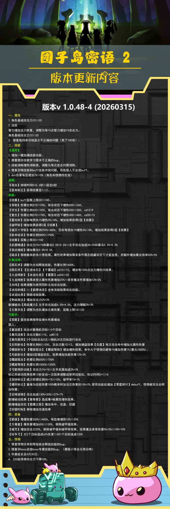 欢迎大家加qq群935413586 一起讨论。 #发现好游戏 #游戏日常 #团子岛密语2 一、新增内容1.新增280、300地图和副本。2.等级、防御、宠物等级提高至300级。3.新增7只宠物。二、属性和技能通用:1. 提高280级以上角色等级生命成长。2.【召唤兽类会大幅调整机制】取消召唤兽继承角色破甲、破甲率和双防,平衡性改为按照怪物75。命中设置为怪物*队伍等级*2,回避设为
