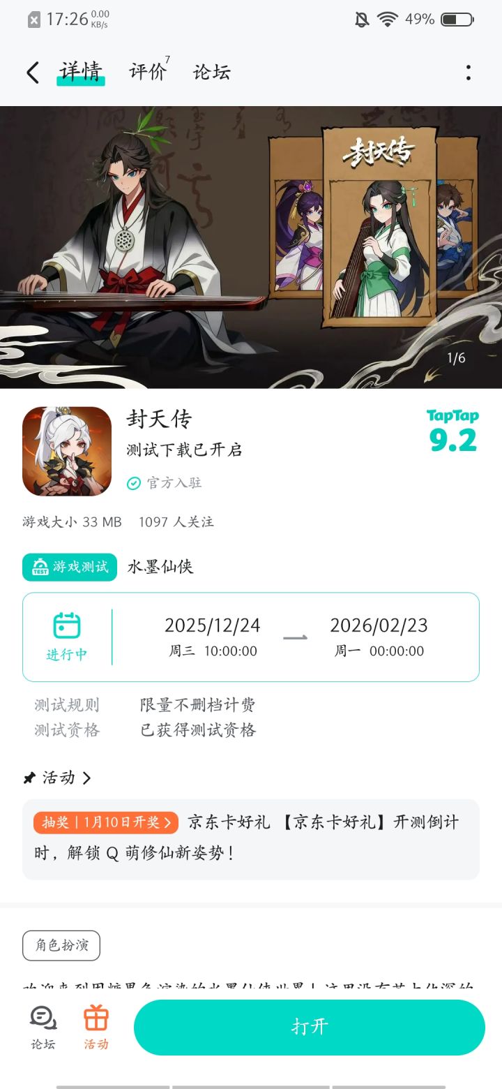 🌟 仙门大开,就等你赴约 🌟不用渡劫,不用内卷,只要甜甜蜜蜜修仙,开开心心收集~快拉上闺蜜、兄弟一起,在糖果水墨世界里,经营属于你的萌系仙途吧!⏰开测时间:2025年12月24日 10:00🎁 开测专属福利:【京东卡抽奖活动】▶ 参与方式1.点击关注发帖账号并预约《封天传》且发新帖晒截图2.在本帖下方评论区分享发帖链接即可【奖品发放】到达开奖时间后,由taptap系统随机抽取符