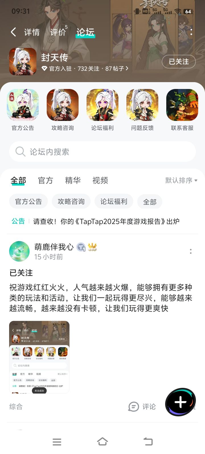 🌟 仙门大开,就等你赴约 🌟不用渡劫,不用内卷,只要甜甜蜜蜜修仙,开开心心收集~快拉上闺蜜、兄弟一起,在糖果水墨世界里,经营属于你的萌系仙途吧!⏰开测时间:2025年12月24日 10:00🎁 开测专属福利:【京东卡抽奖活动】▶ 参与方式1.点击关注发帖账号并预约《封天传》且发新帖晒截图2.在本帖下方评论区分享发帖链接即可【奖品发放】到达开奖时间后,由taptap系统随机抽取符