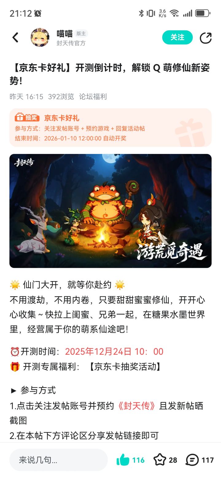 🌟 仙门大开,就等你赴约 🌟不用渡劫,不用内卷,只要甜甜蜜蜜修仙,开开心心收集~快拉上闺蜜、兄弟一起,在糖果水墨世界里,经营属于你的萌系仙途吧!⏰开测时间:2025年12月24日 10:00🎁 开测专属福利:【京东卡抽奖活动】▶ 参与方式1.点击关注发帖账号并预约《封天传》且发新帖晒截图2.在本帖下方评论区分享发帖链接即可【奖品发放】到达开奖时间后,由taptap系统随机抽取符