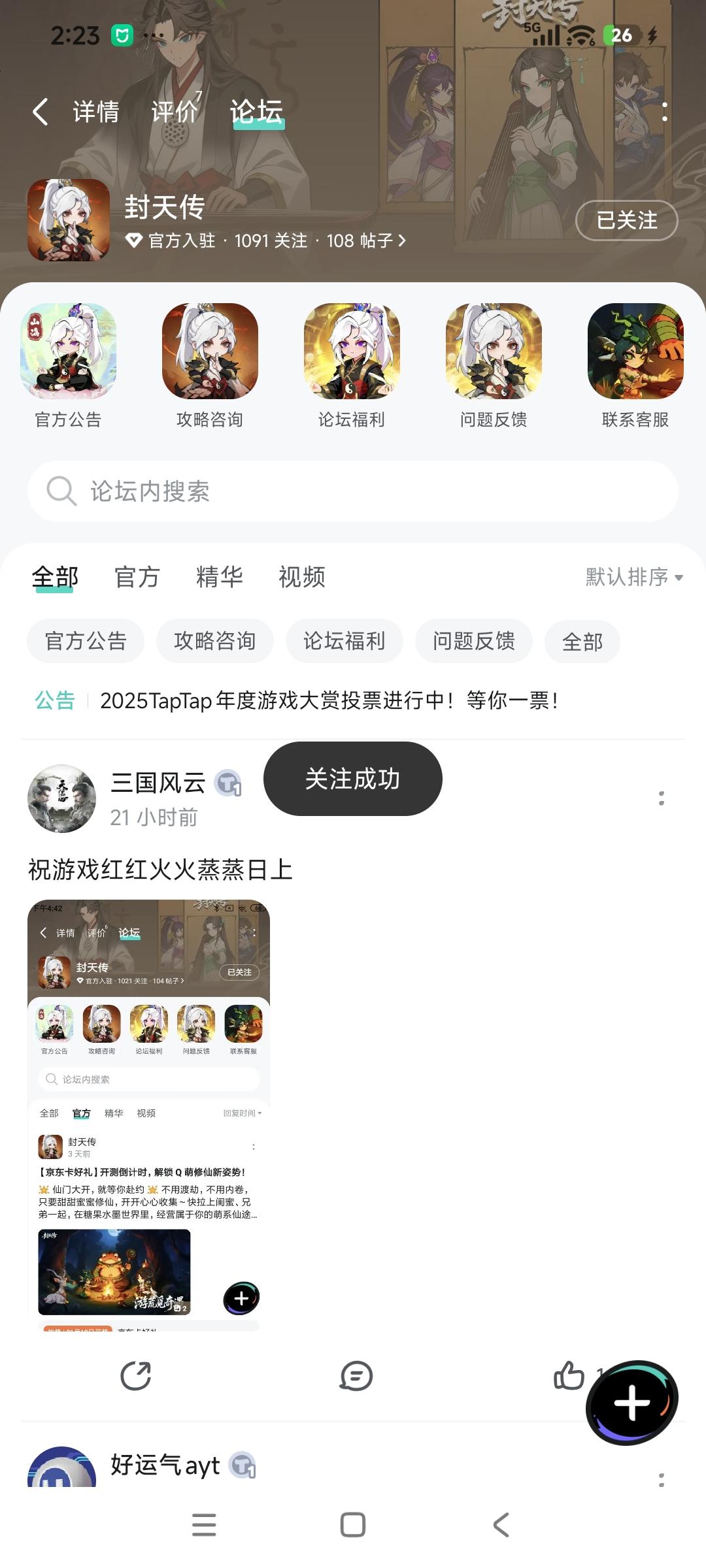 🌟 仙门大开,就等你赴约 🌟不用渡劫,不用内卷,只要甜甜蜜蜜修仙,开开心心收集~快拉上闺蜜、兄弟一起,在糖果水墨世界里,经营属于你的萌系仙途吧!⏰开测时间:2025年12月24日 10:00🎁 开测专属福利:【京东卡抽奖活动】▶ 参与方式1.点击关注发帖账号并预约《封天传》且发新帖晒截图2.在本帖下方评论区分享发帖链接即可【奖品发放】到达开奖时间后,由taptap系统随机抽取符