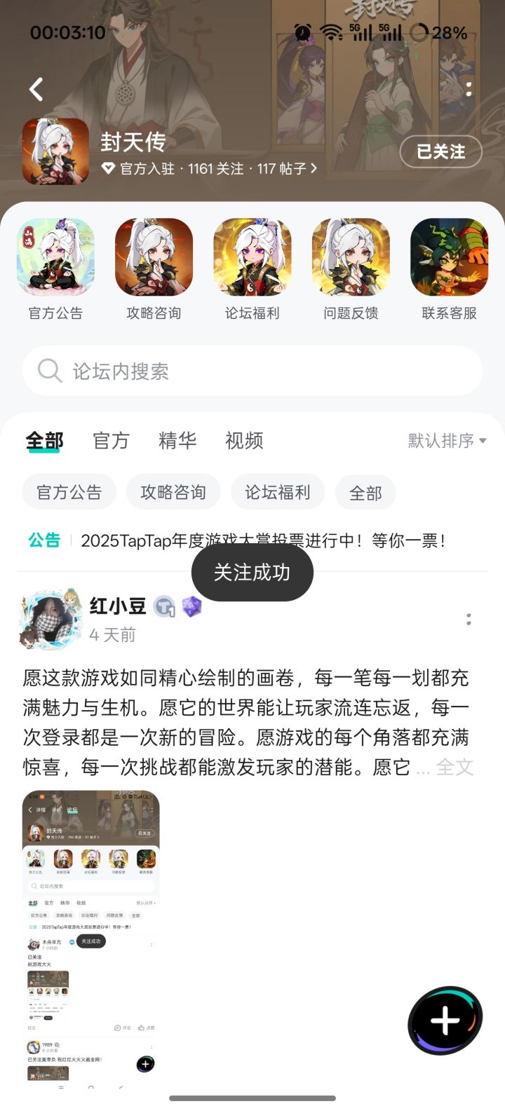 🌟 仙门大开,就等你赴约 🌟不用渡劫,不用内卷,只要甜甜蜜蜜修仙,开开心心收集~快拉上闺蜜、兄弟一起,在糖果水墨世界里,经营属于你的萌系仙途吧!⏰开测时间:2025年12月24日 10:00🎁 开测专属福利:【京东卡抽奖活动】▶ 参与方式1.点击关注发帖账号并预约《封天传》且发新帖晒截图2.在本帖下方评论区分享发帖链接即可【奖品发放】到达开奖时间后,由taptap系统随机抽取符