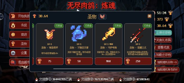 这游戏比较简单,没有什么特别难搞难钻研的机制,说说自己的心得。首先除了增强宠物的,其他所有圣物都有它存在的重要性,能点满全部点满,另外个人感觉最重要的是爆炸伤害,其次是经验倍率,其他内容都是浮云,而且主要是局外数据,局内数据只能说到后面聊胜于无,但等级还得升,影响血量,血量很重要,低了容易被秒;但血量高了也容易被秒,这就不得不说到霸王弓,后期想不被秒的话击退必须拉满(远程),因为容易被近战bos