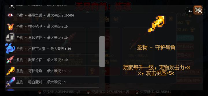 首先打到4个小时之后就可以说是中期了,这个时候基本上圣物都拥有了,圣物上除了嗜血魔剑其他都可以带,但是远古巨剑没满级的话就不要带了,攻击方式确实不是很好,满级之后伤害比那俩个要高很多。其中最重要的就是飞升护符,如果生命等级不是很高(30万以下)的话,就可以把不自动升级打开,然后从零开始打到扛不住(差不多3个小时左右)然后再升级(可以把自动选择打开),然后再把不自动升级关了(因为这个时候杀怪得的生