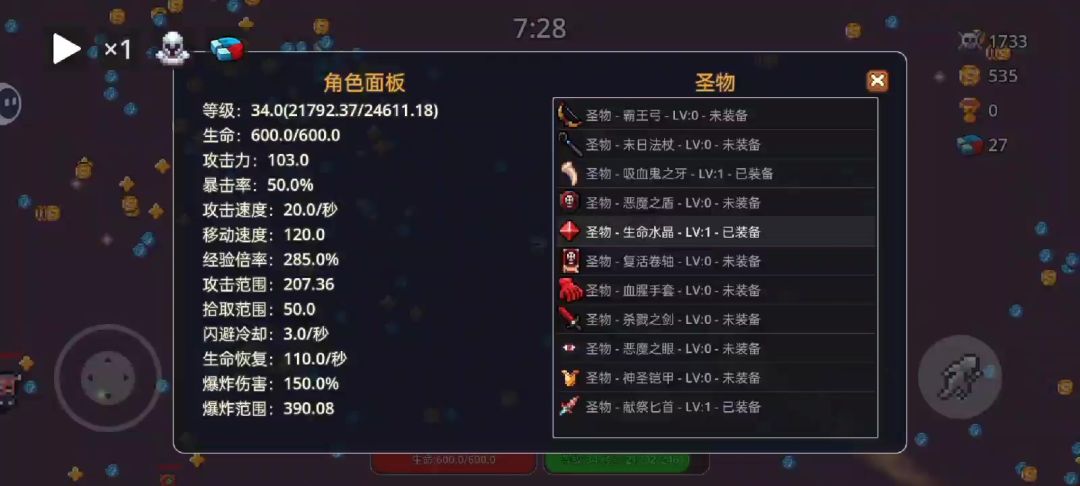 开局就可以挂机了,圣物主要升级叠生命跟攻击,有个吸血就挂机了
