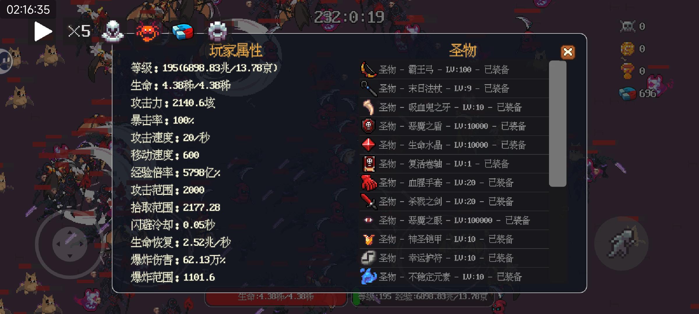 这游戏比较简单,没有什么特别难搞难钻研的机制,说说自己的心得。首先除了增强宠物的,其他所有圣物都有它存在的重要性,能点满全部点满,另外个人感觉最重要的是爆炸伤害,其次是经验倍率,其他内容都是浮云,而且主要是局外数据,局内数据只能说到后面聊胜于无,但等级还得升,影响血量,血量很重要,低了容易被秒;但血量高了也容易被秒,这就不得不说到霸王弓,后期想不被秒的话击退必须拉满(远程),因为容易被近战bos